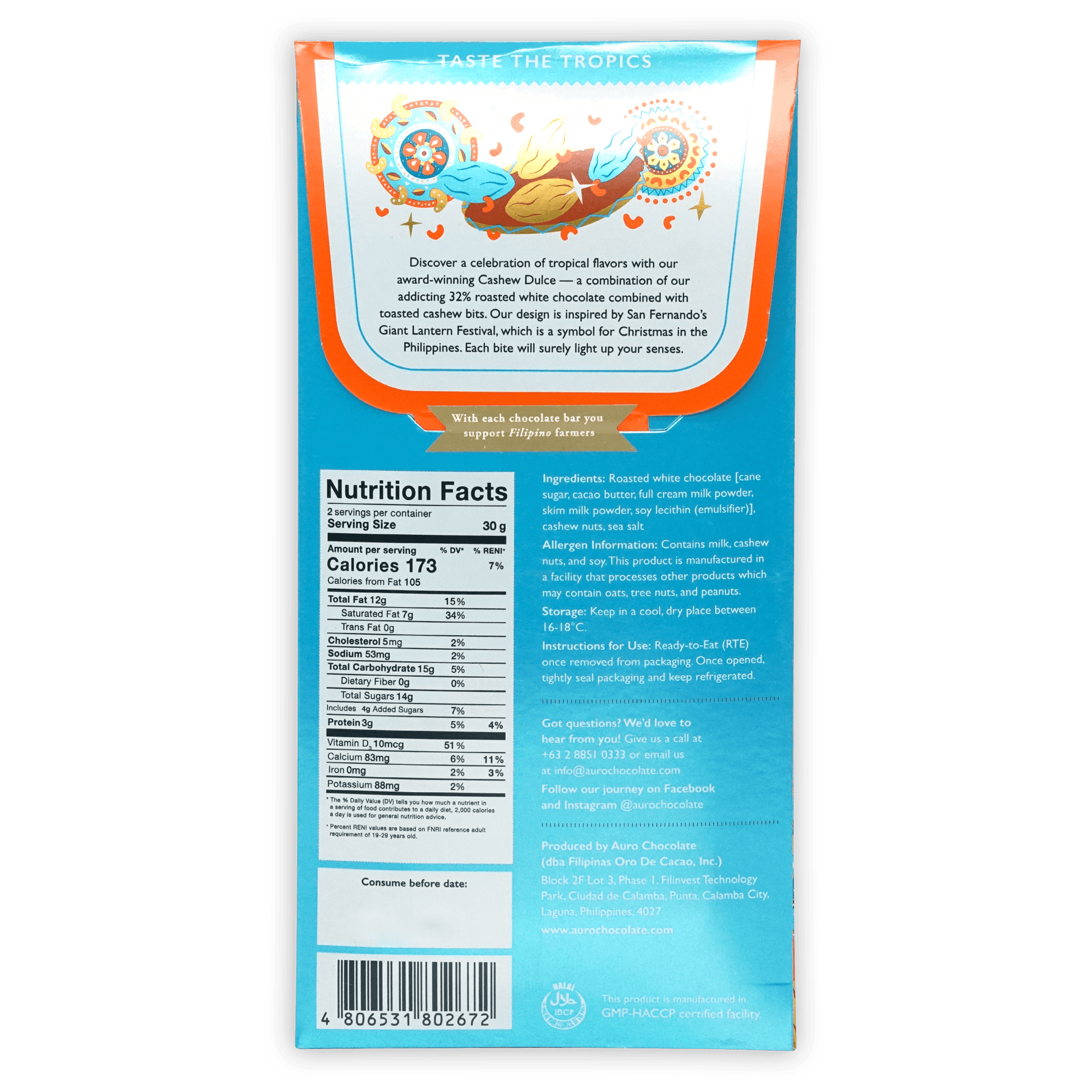 Discover a celebration of tropical flavors with Auro's award-winning Cashew Dulce - a combination of their addicting 32% roasted white chocolate combined with toasted cashew bits. Auro's design is inspired by San Fernando's Giant Lantern Festival, which is a symbol for Christmas in the Philippines. Each bite will surely light up your senses.
