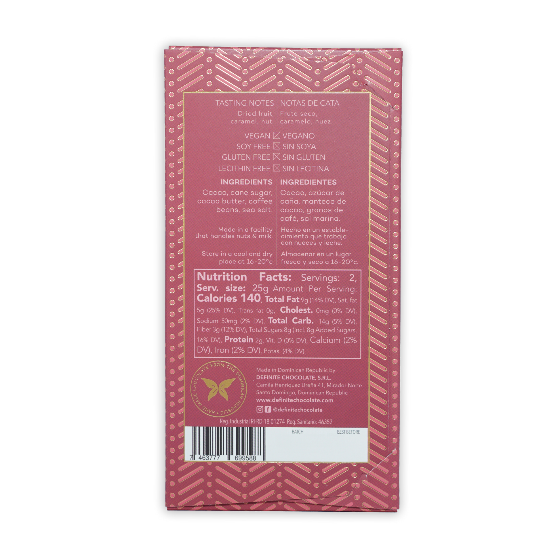 Ingredients: organic cacao beans, organic cacao butter, organic cane sugar, coffee beans, sea salt.