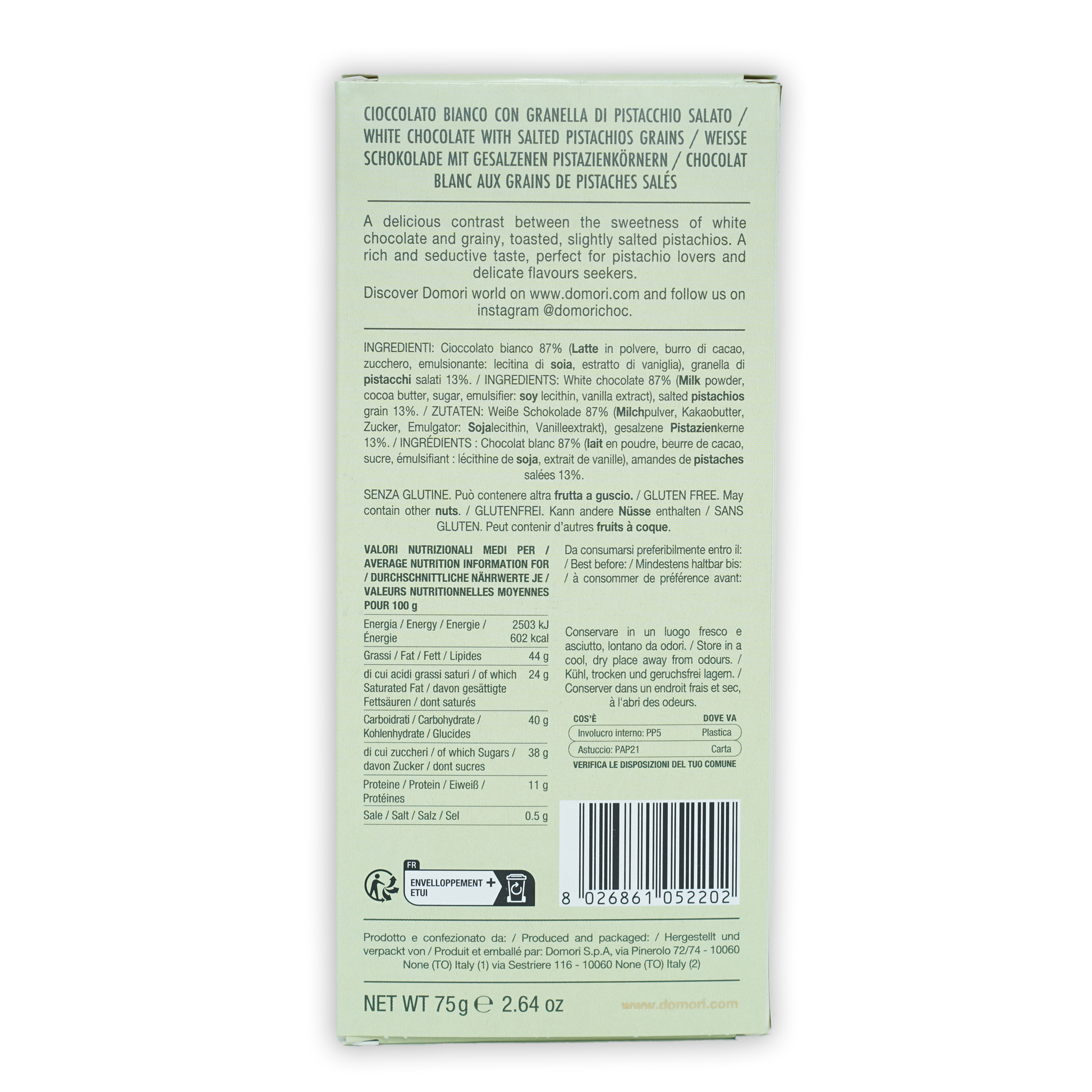 Ingredients: White chocolate (milk powder, cocoa butter, sugar, emulsifier: soy lecithin, vanilla extract, salted pistachios grain 13%.