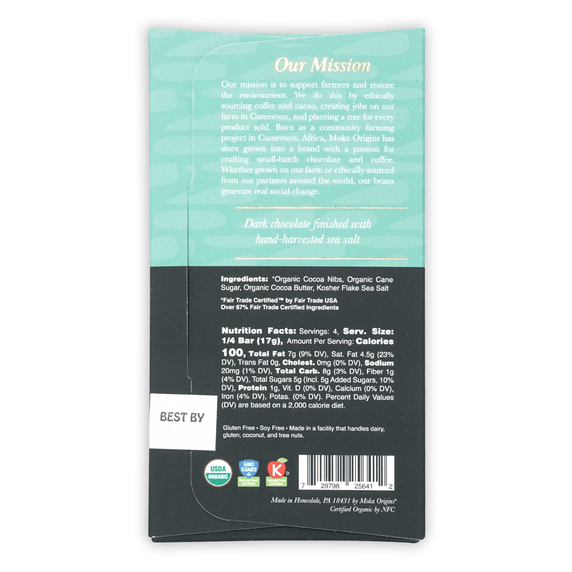 Ingredients: organic cacao beans, organic cane sugar, organic cocoa butter, flake sea salt