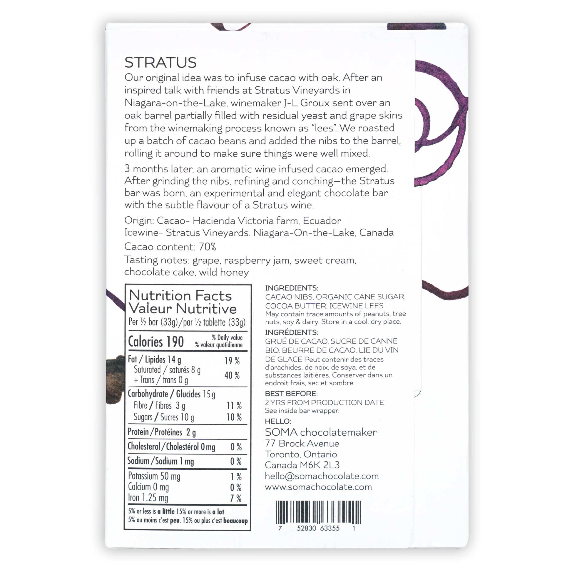 Soma is one of my favorite chocolatiers and this bar is one of the reasons why. The flavor of the icewine lees is delicate and very complementary to the flavor profile of the chocolate.