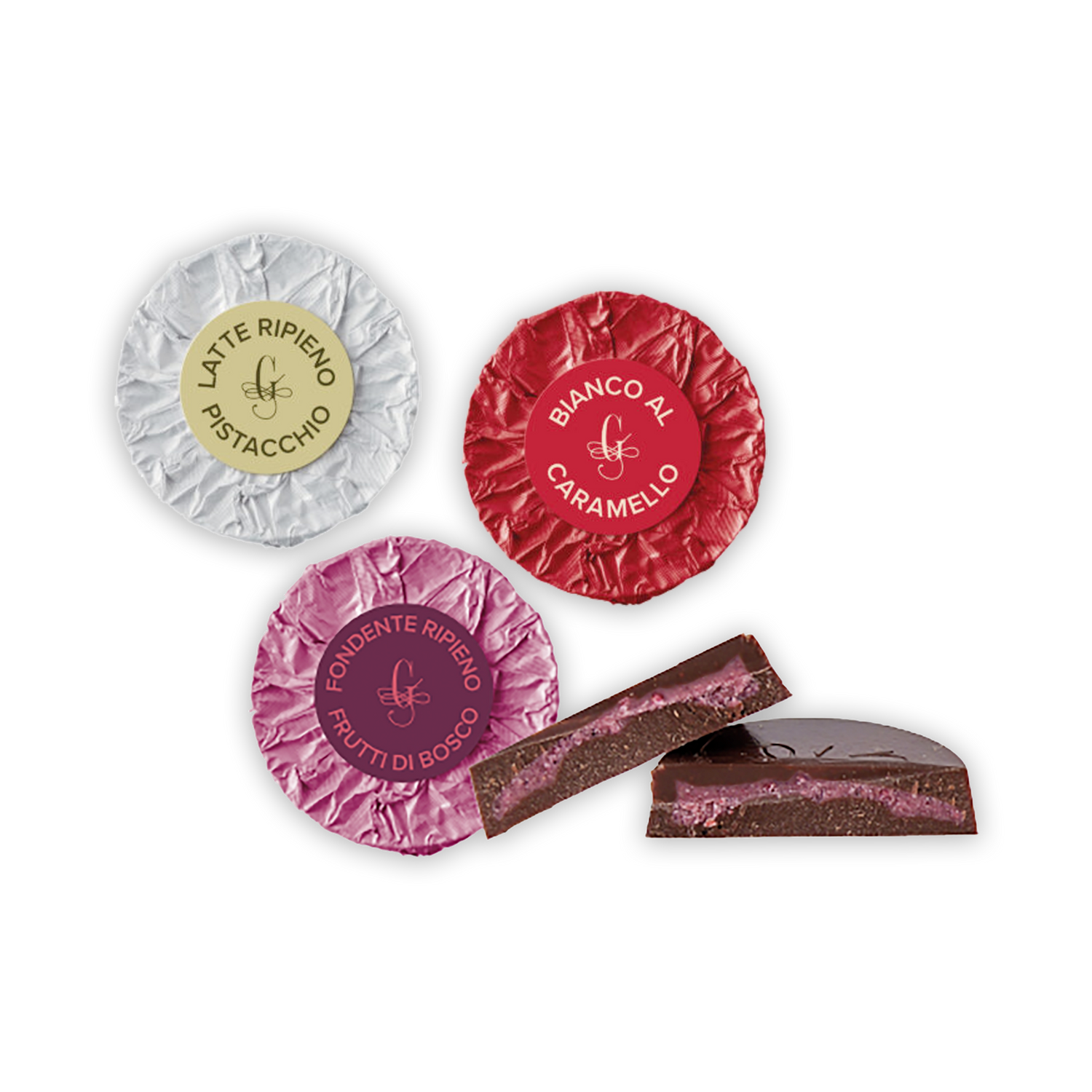 Guido Gobino Chocolate Filled Disks: Pistachio, Berries, Caramel