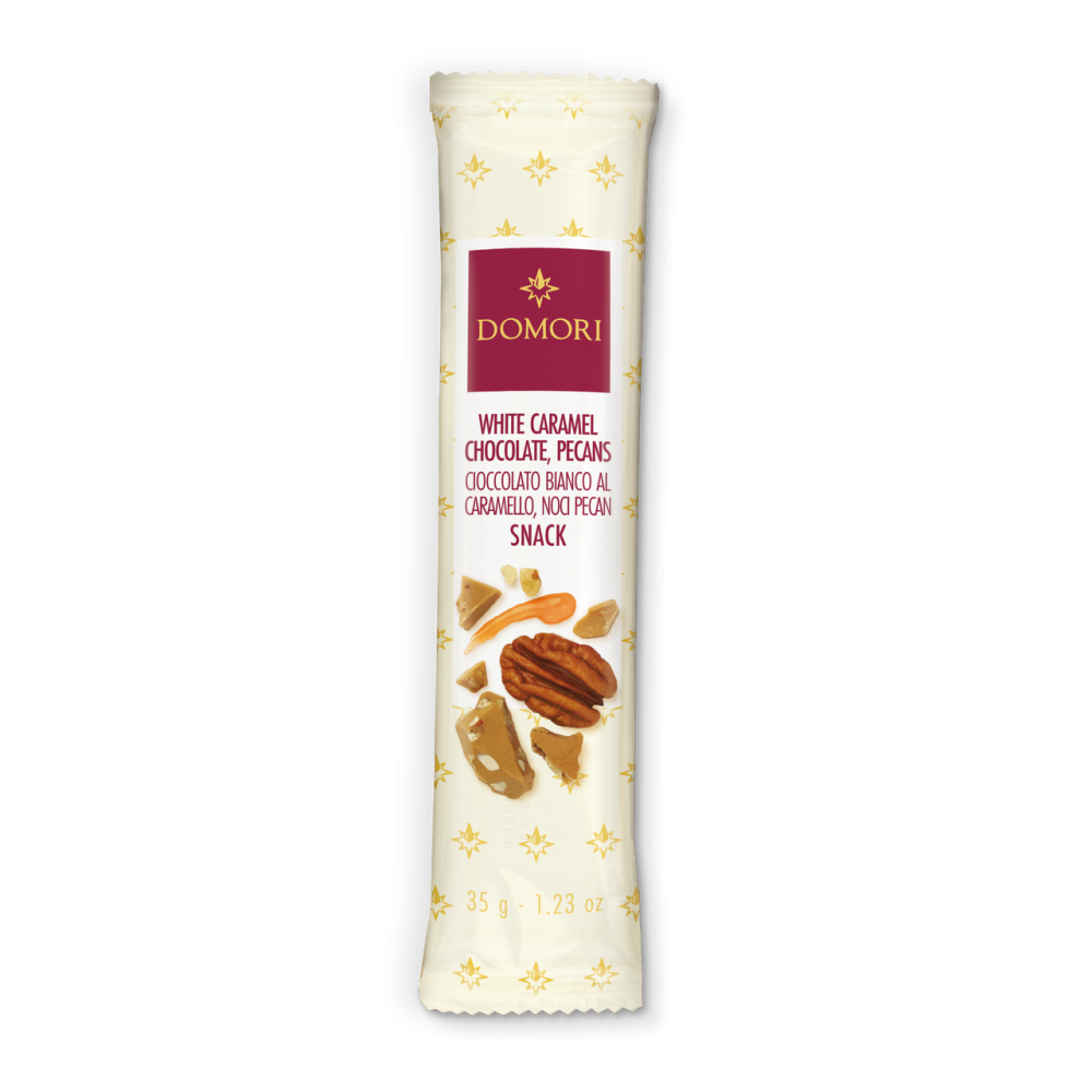 Crushed pecans combined with the sweetness of caramel and the smoothness of white chocolate, in a pocket-sized format.