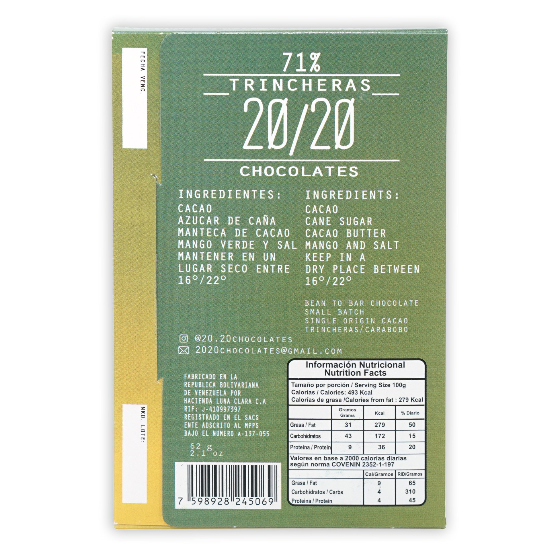 Made with cacao from Trincheras in the central region of Venezuela. This bar includes a very exotic and local combination of green mango and salt, a very delicious treat that takes most of their local consumers back to their childhood days.