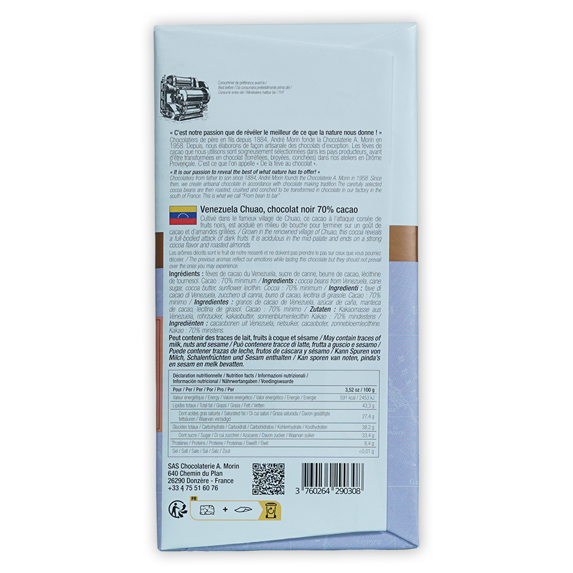 Chocolaterie A. MorinA Morin Chocolatiers are a 4th generation chocolate maker in Donzère, France. Chocolatiers from father to son since 1994, André Morin founded Chocolaterie A. Morin in 1958 to start making bean to bar chocolate. Since then, they have created artisan chocolate in accordance with chocolate making tradition.They have spent years cultivating relationships with their cocoa producers and farmers to create their line of single origin chocolate bars. They also cultivate over 15,000 acres of fruit and nut orchards to use as raw ingredients such as almonds, hazelnuts and cherries for their pralines, pastes, nougats and jams.