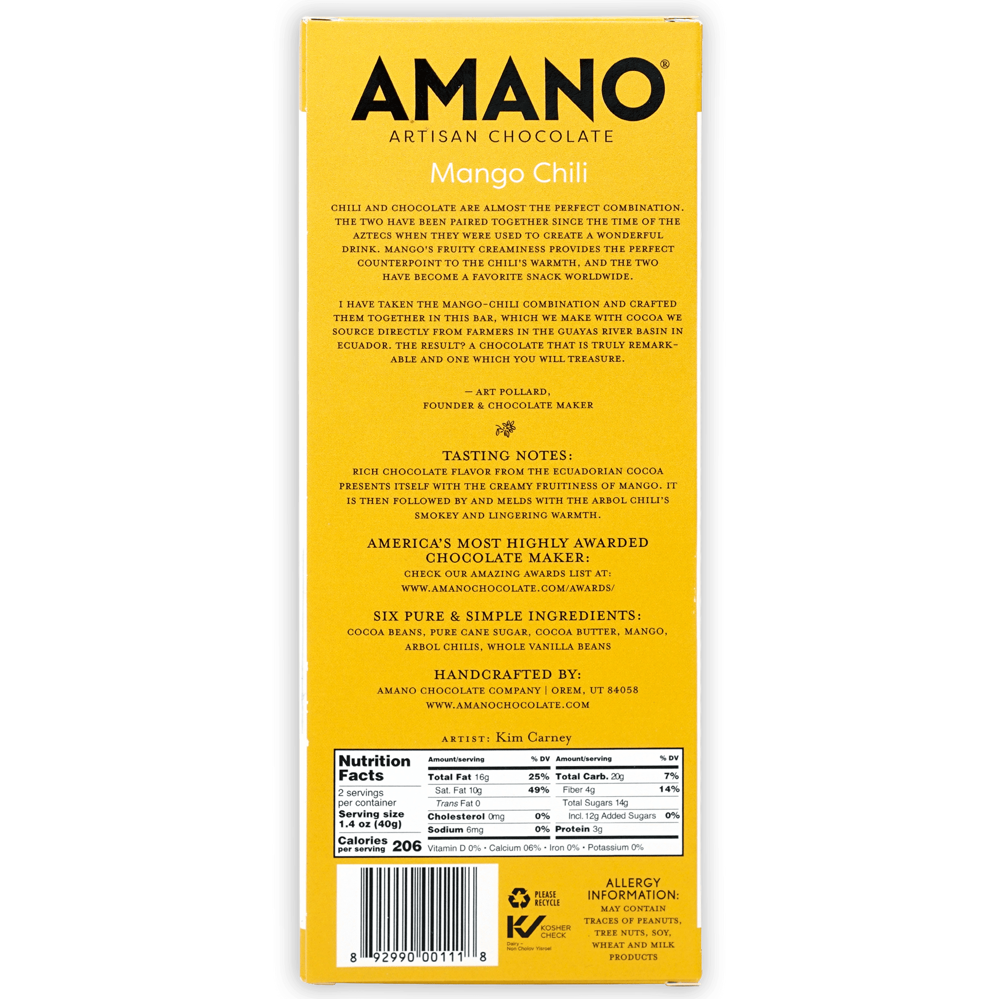 Ingredients: cocoa beans, cocoa butter, pure cane sugar, freeze-dried mango, arbol chilies, whole vanilla bean