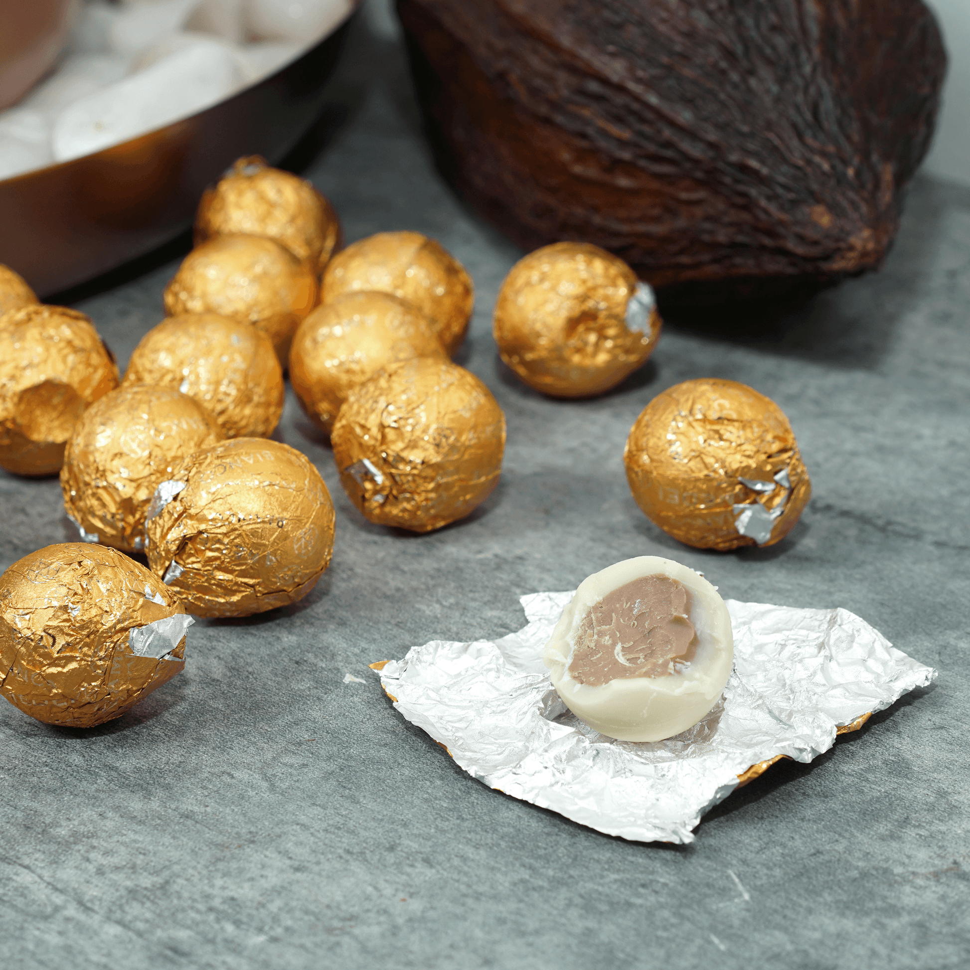 Amedei's bite-sized white chocolate praline filled with hazelnut and pistachio paste in a sphere shape, made with only the finest ingredients in Italy.