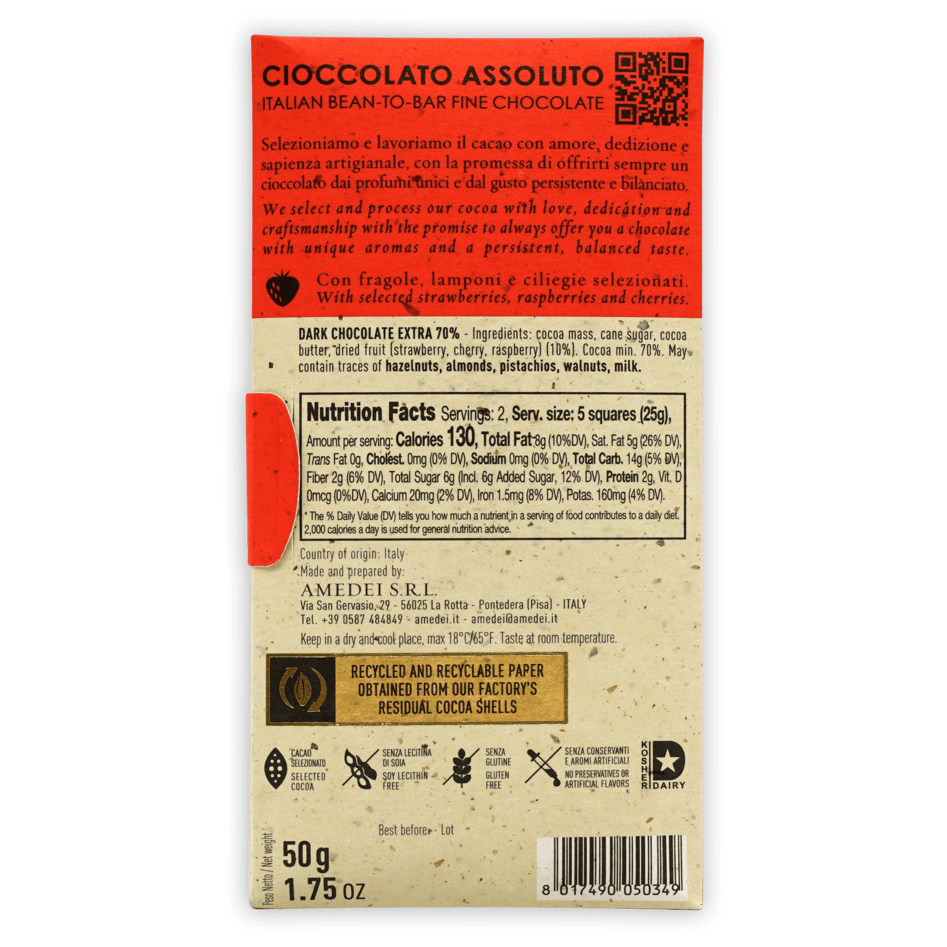 Ingredients: cocoa mass, cane sugar, cocoa butter, dried fruit (strawberry, cherry, raspberry) (10%), cocoa min. 70%