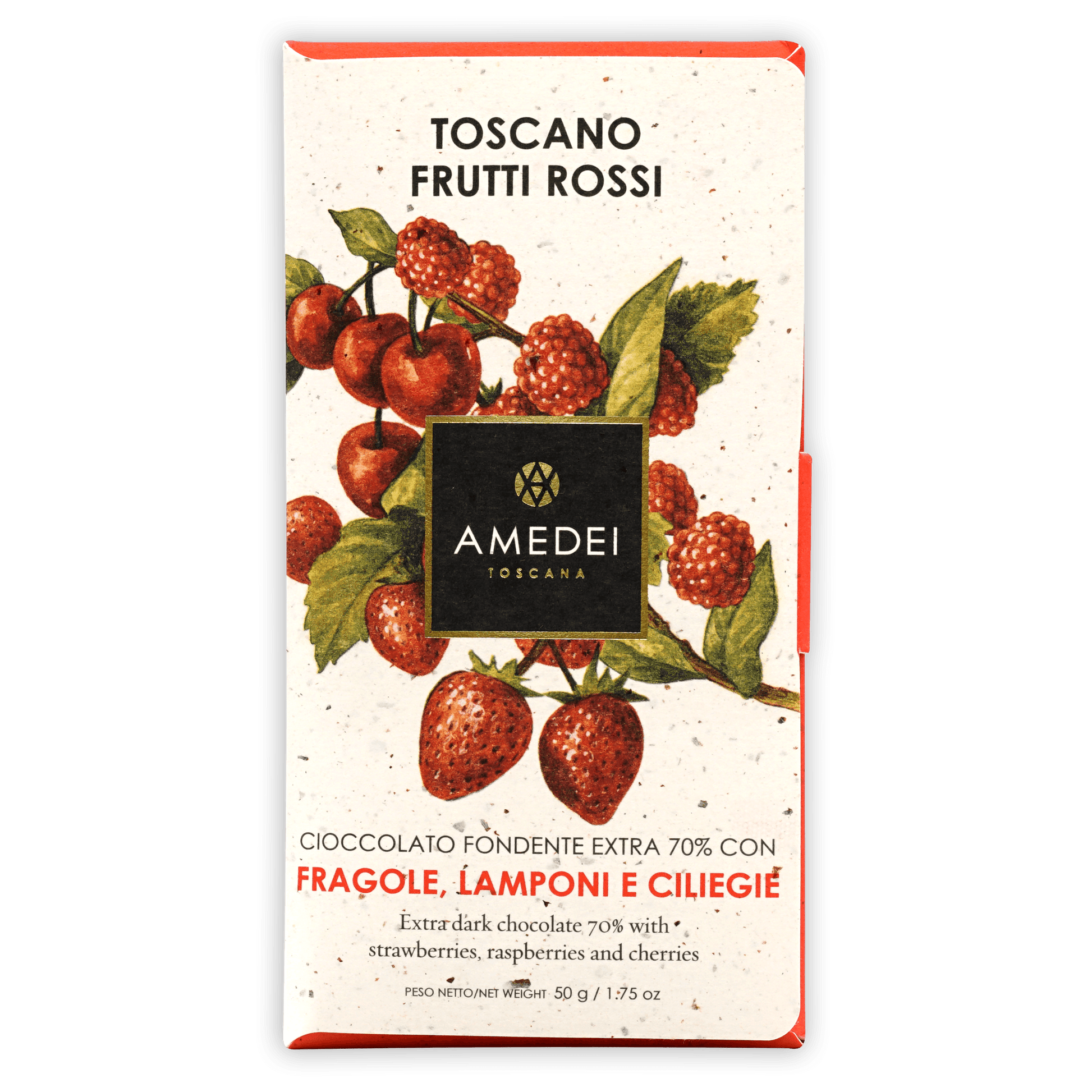 Extra dark chocolate with strawberries, cherries and raspberries. The delicate yet rich flavors mingle for an indulgent and luxurious experience that's truly unique.