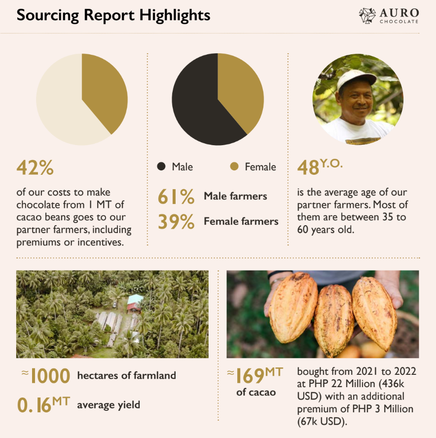 Auro ChocolateAuro Chocolate is a Filipino bean to bar chocolate company that practices sustainable harvesting of cacao which they get directly from farms in Davao Philippines. Owners Mark Ocampo and Kelly Go, originally political science majors, with no background in pastries or chocolate at all, took a trip to the Philippines where their love for small craft chocolate was born. Auro is committed to restore local heirloom varieties of Filipino cacao and showcase Filipino taste varieties and culture from the Davao region in some of their single estate chocolate bars. Auro provides support and education to its farmers to teach them organic farming and important business management fundamentals in order to improve their standards of living. Auro is globally recognized and have won awards for their chocolate. Mark and Kelly wanted their chocolate company to reflect something with gold. They believe that like gold, farmers and cacao are not given the recognition they deserve. Both gold and cacao are not fully cherished in its raw form until its been altered, that’s when people see its true value.