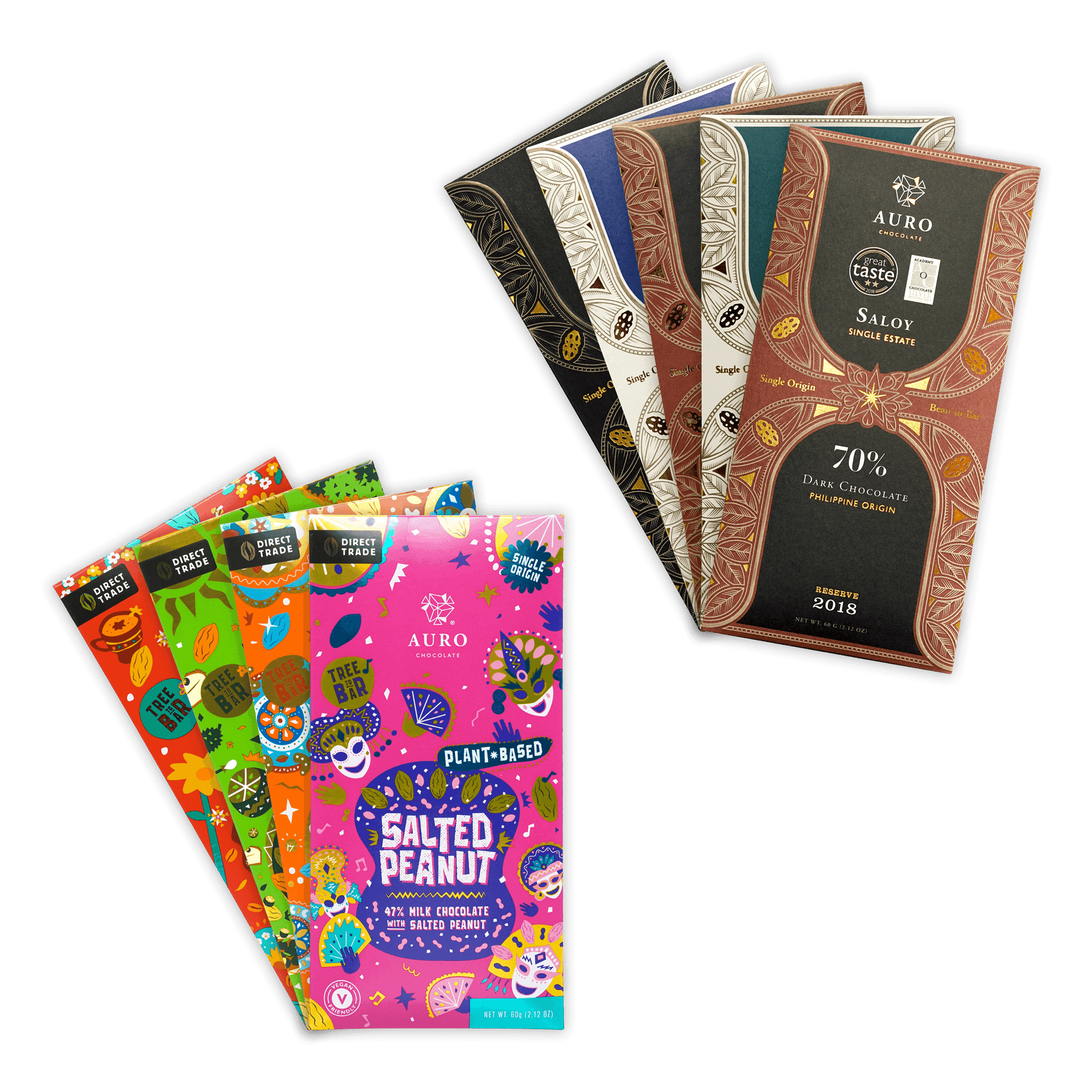 Dig into two of Auro's chocolate collections. Their Reserve chocolate bars featuring unrefined muscovado sugar and unique single-estate or regional cacao beans. Or their friendly for everyone Fiesta bars celebrating Filipino flavors and more!