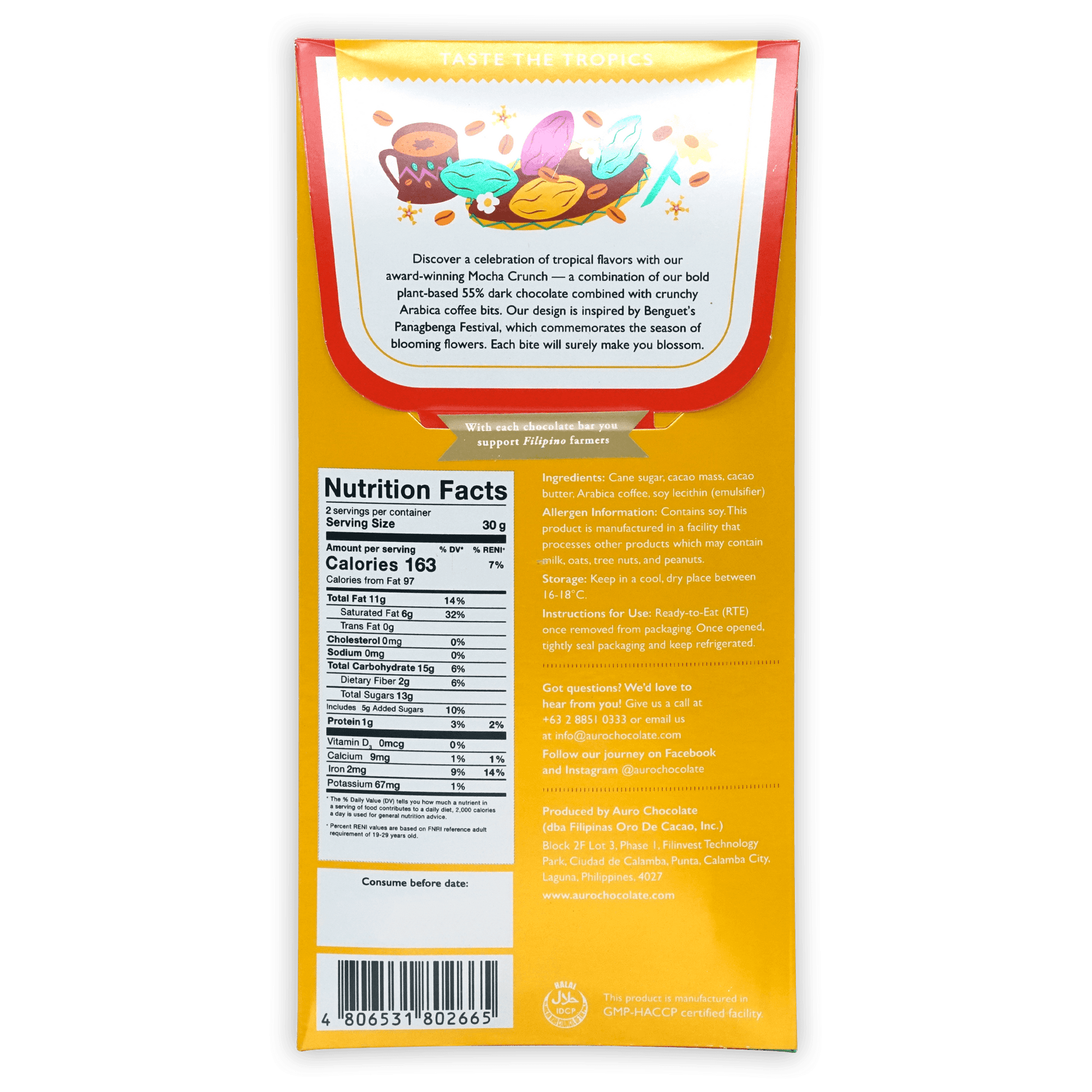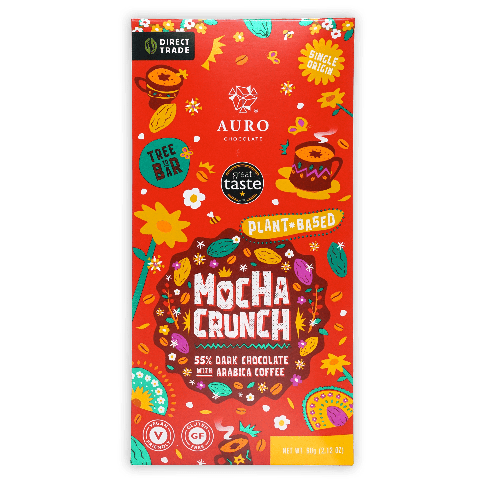 Discover a celebration of tropical flavors with Auro's award-winning Mocha Crunch - a combination of their bold plant-based 55% dark chocolate combined with crunchy Arabica coffee bits.