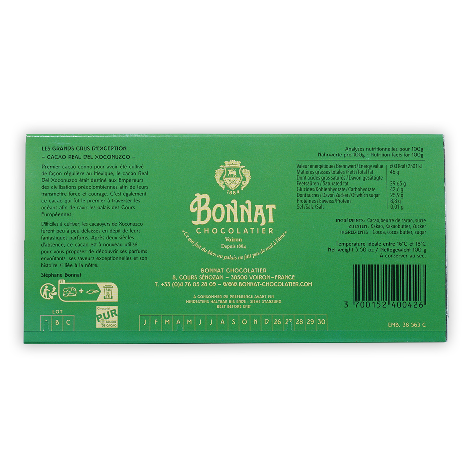 BonnatChocolat Bonnat is a French chocolate maker that started in 1884 and has been handed down the family for generations. Made in a traditional style, the single origin chocolate bars here are super rich from added cocoa butter, giving them all an amazing melt mouthfeel. Since the 1980's Bonnat has continued to pioneer the creation of single origin bars. They work with 35 different plantations around the globe to produce bars that showcase each cacao’s unique flavor. Bonnat works closely with each farmer, so he can see first hand each vital step that goes into his fine quality chocolate bars.