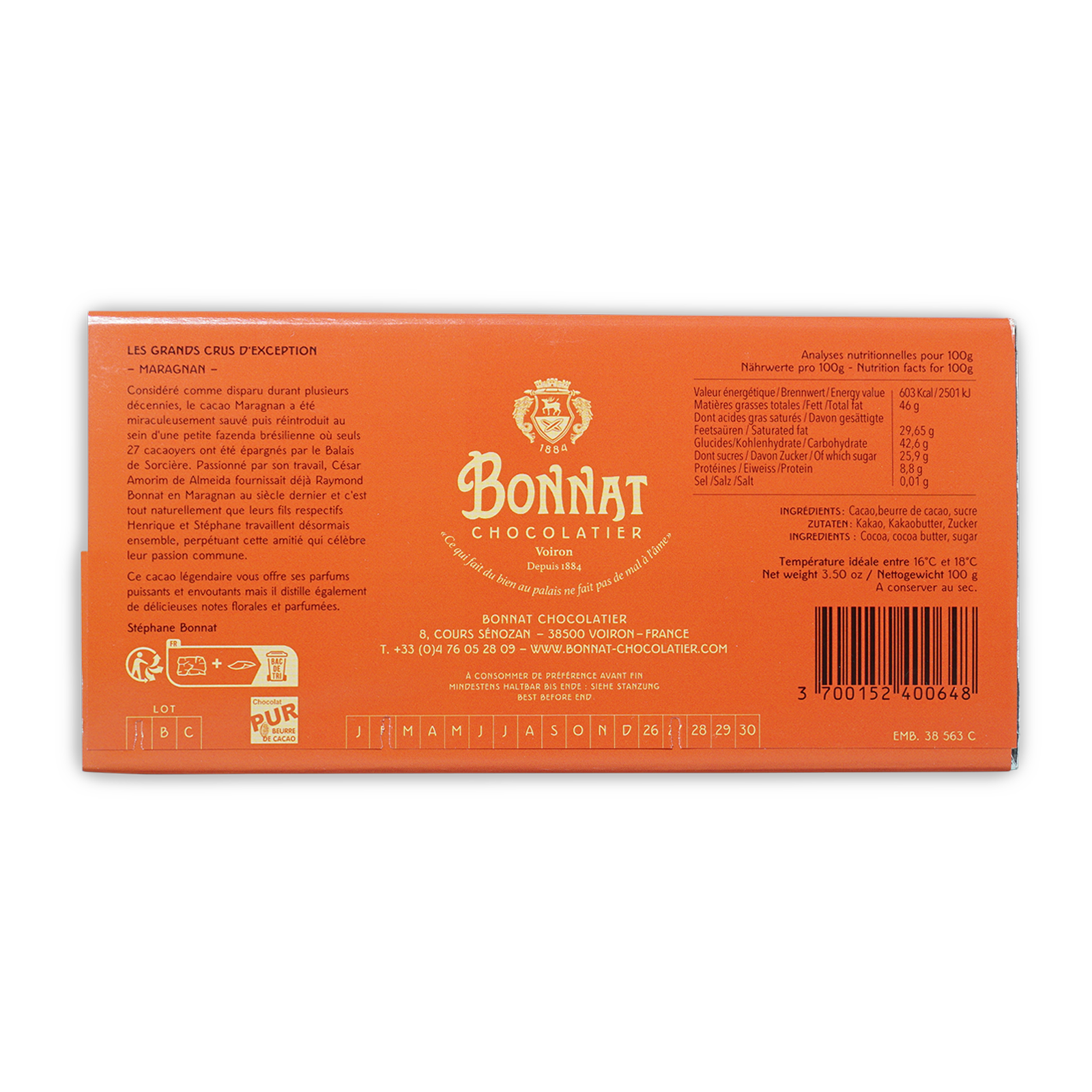 BonnatChocolat Bonnat is a French chocolate maker that started in 1884 and has been handed down the family for generations. Made in a traditional style, the single origin chocolate bars here are super rich from added cocoa butter, giving them all an amazing melt mouthfeel. Since the 1980's Bonnat has continued to pioneer the creation of single origin bars. They work with 35 different plantations around the globe to produce bars that showcase each cacao’s unique flavor. Bonnat works closely with each farmer, so he can see first hand each vital step that goes into his fine quality chocolate bars.