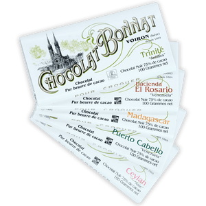 BonnatChocolat Bonnat is a French chocolate maker that started in 1884 and has been handed down the family for generations. Made in a traditional style, the single origin chocolate bars here are super rich from added cocoa butter, giving them all an amazing melt mouthfeel. Since the 1980's Bonnat has continued to pioneer the creation of single origin bars. They work with 35 different plantations around the globe to produce bars that showcase each cacao’s unique flavor. Bonnat works closely with each farmer, so he can see first hand each vital step that goes into his fine quality chocolate bars.
