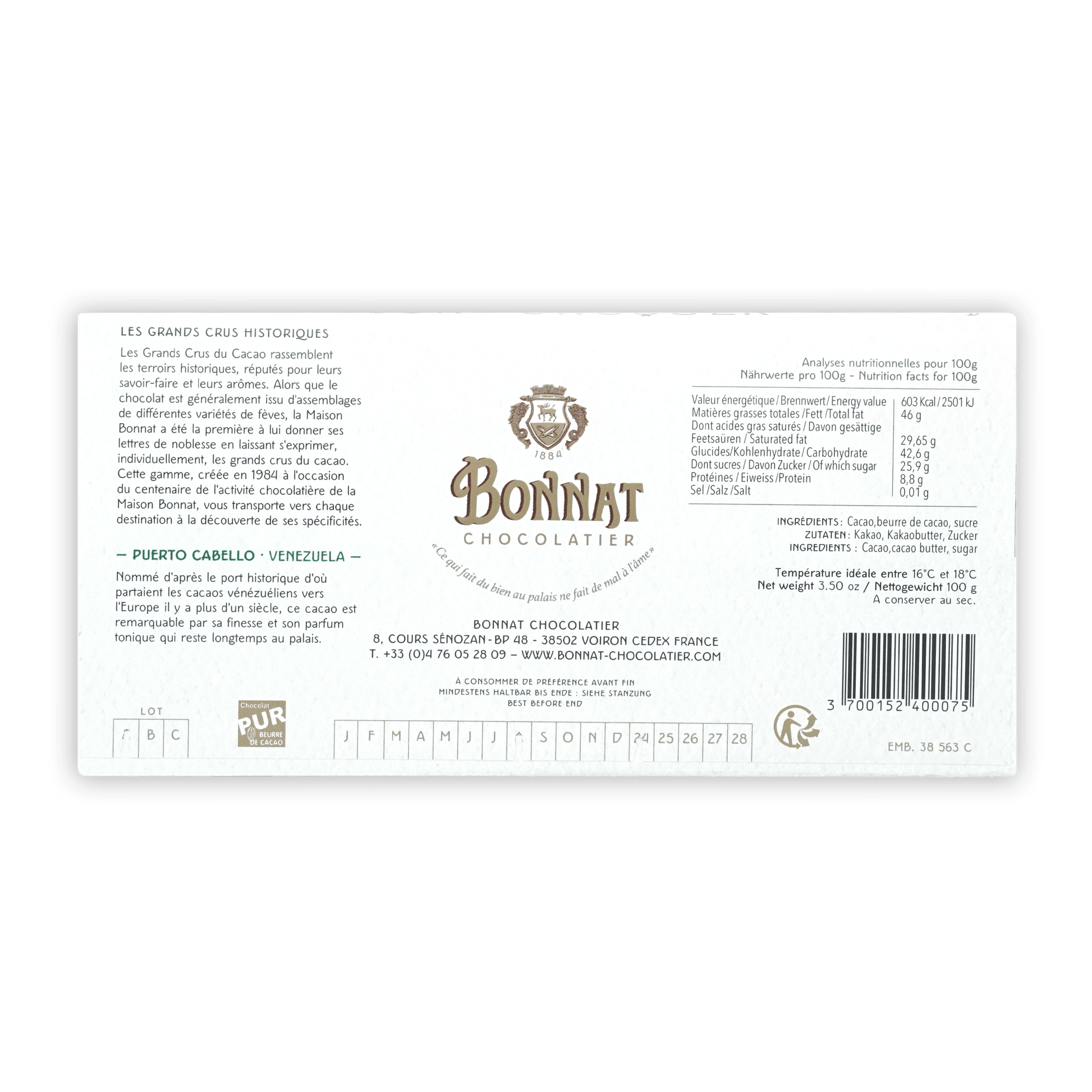 BonnatChocolat Bonnat is a French chocolate maker that started in 1884 and has been handed down the family for generations. Made in a traditional style, the single origin chocolate bars here are super rich from added cocoa butter, giving them all an amazing melt mouthfeel. Since the 1980's Bonnat has continued to pioneer the creation of single origin bars. They work with 35 different plantations around the globe to produce bars that showcase each cacao’s unique flavor. Bonnat works closely with each farmer, so he can see first hand each vital step that goes into his fine quality chocolate bars.