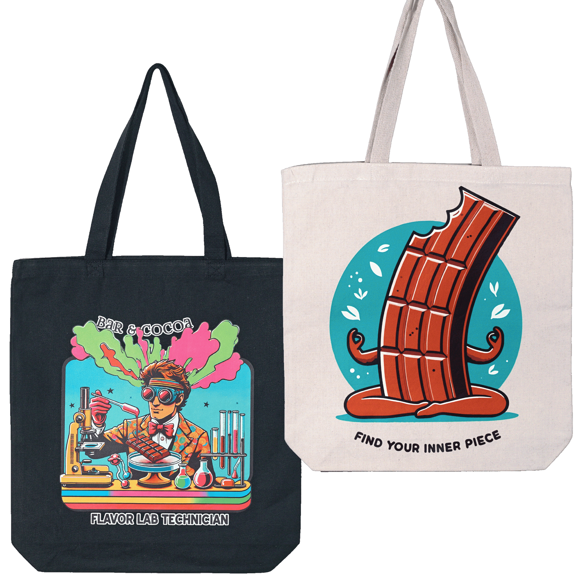 Taking our two popular tee designs, and super sizing them for totes, these charming designs are for chocolate aficionados. These totes are a heavy 12 oz canvas with soft but sturdy fabric handles so you can comfortably carry by hand or over your shoulder.