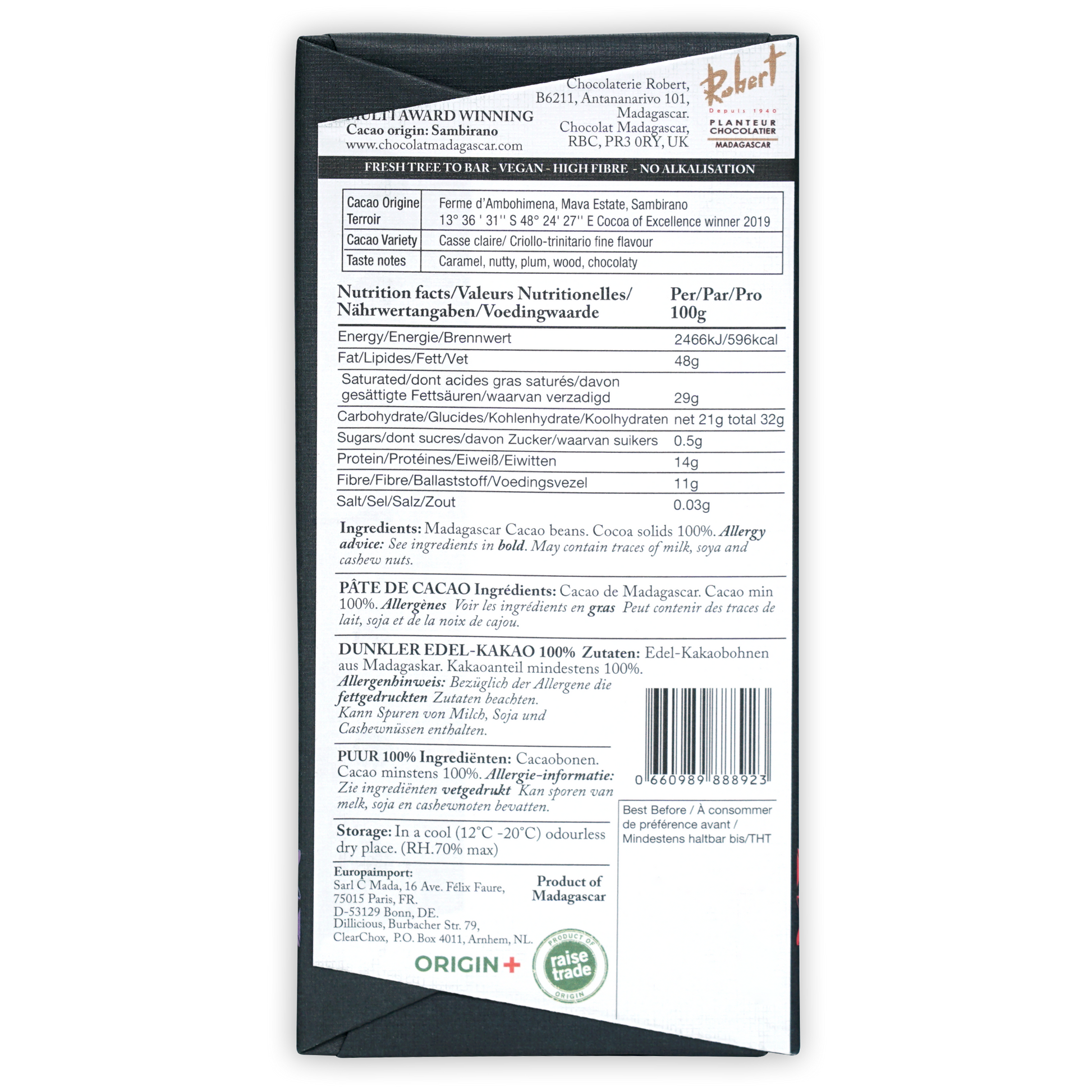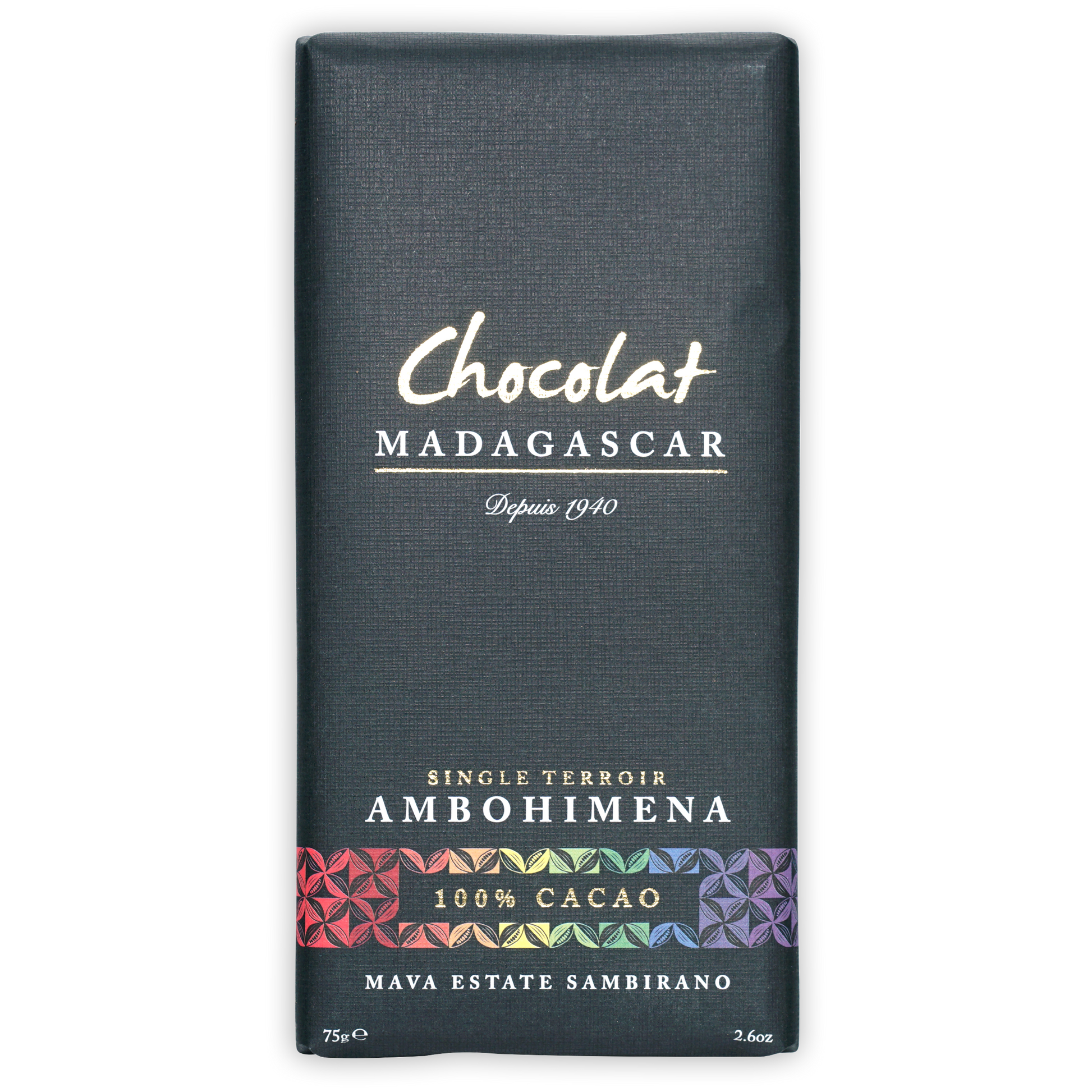 Intensely bitter for the purists that appreciate 100% chocolate. Created from fine flavor cocoa grown exclusively on the Ambohimena farm on the Mava estate in the Sambirano valley, on the island of Madagascar.
