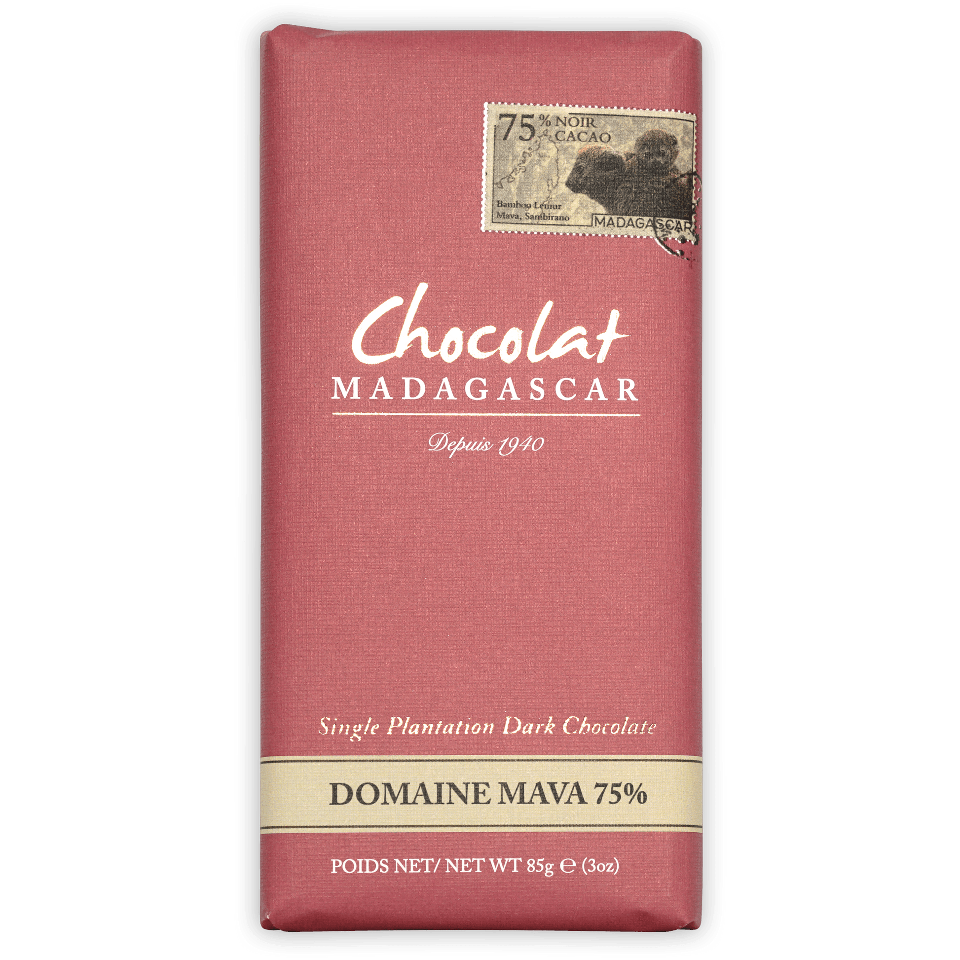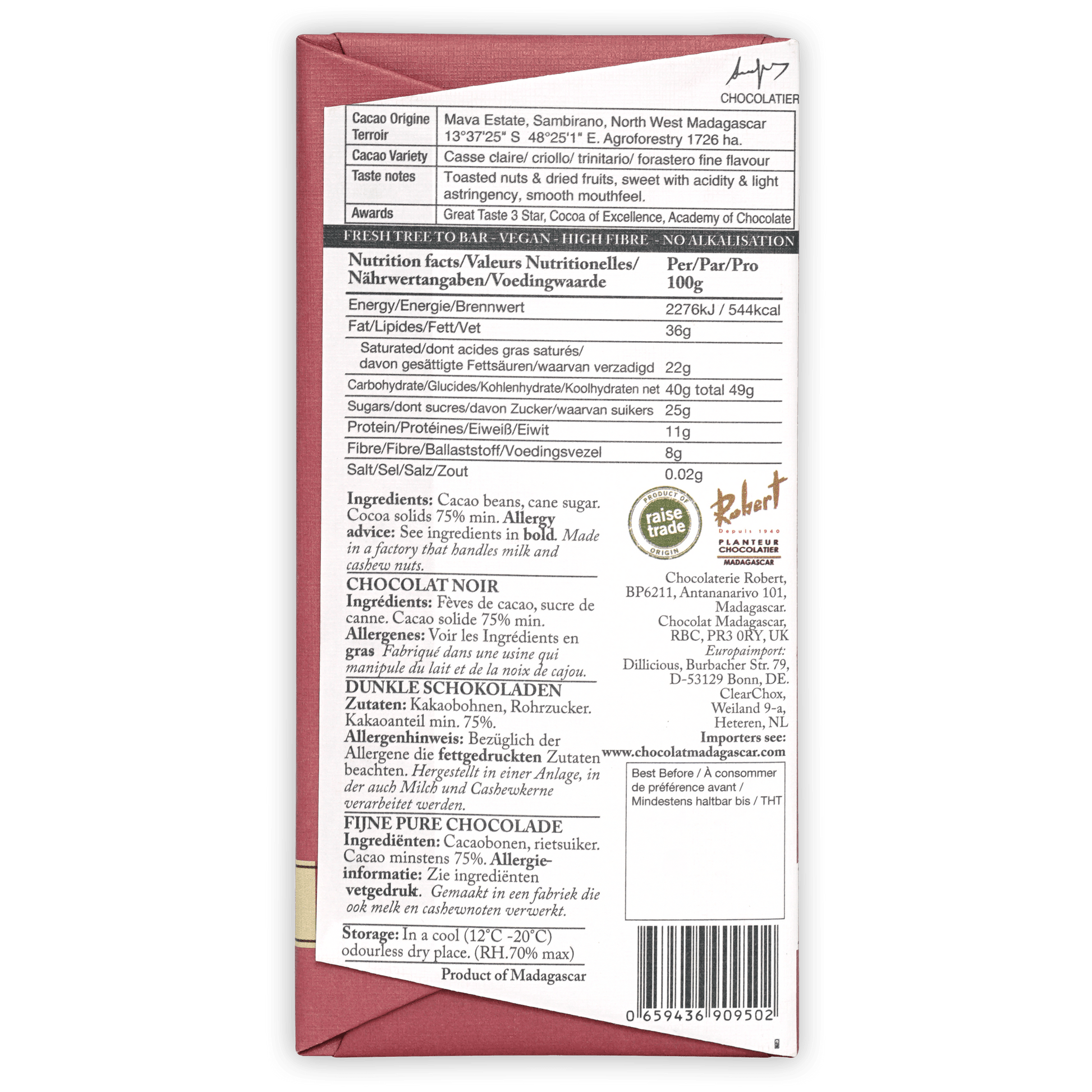 Ingredients: Cocoa beans of Mava plantation Madagascar, cane sugar. Cocoa solids 75% min.