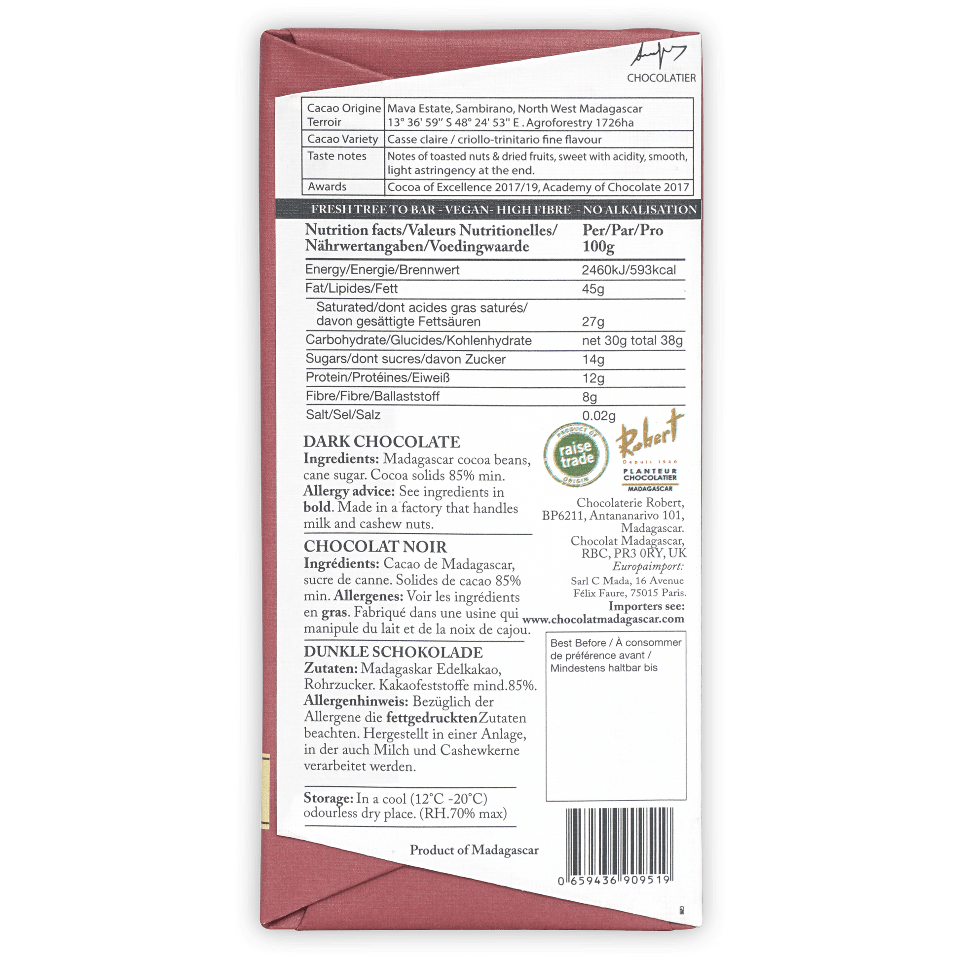 Ingredients: Cocoa beans of Mava domaine Madagascar, cane sugar. Cocoa solids 85%min.