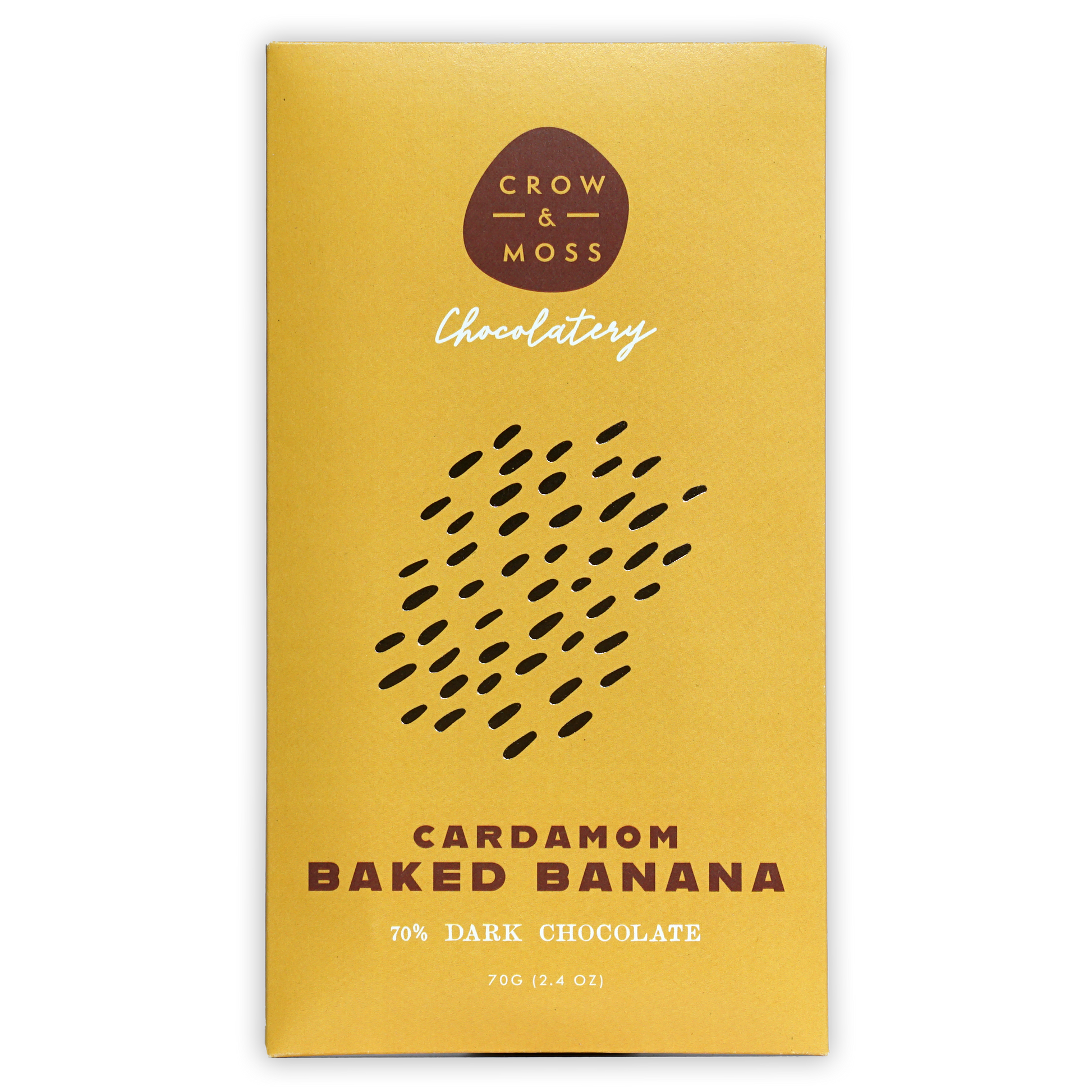 First, they roast the bananas until they caramelize and sear to the pan, intensifying their sweetness. This they blend into sumptuous dark chocolate laced with the exotic, earthy warmth of cardamom. A luxurious take on a soothing childhood favorite.