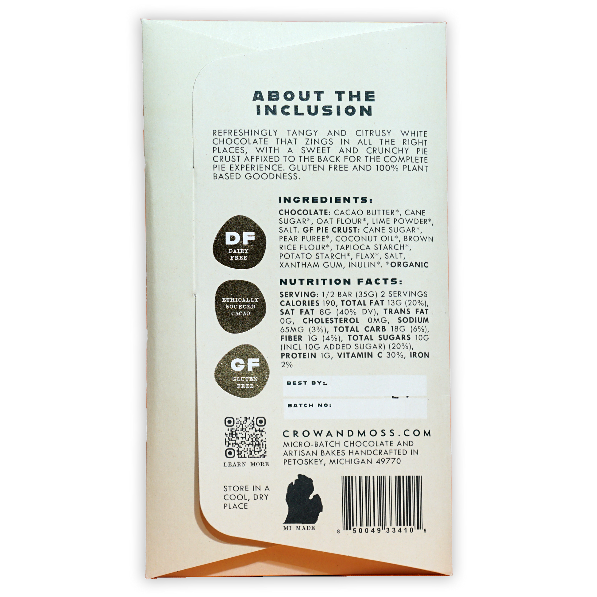 Tangy, citrusy white chocolate that zings in all the right places, with sweet and crunchy pie crust affixed to the back for the complete pie experience. Gluten free and 100% plant based goodness.