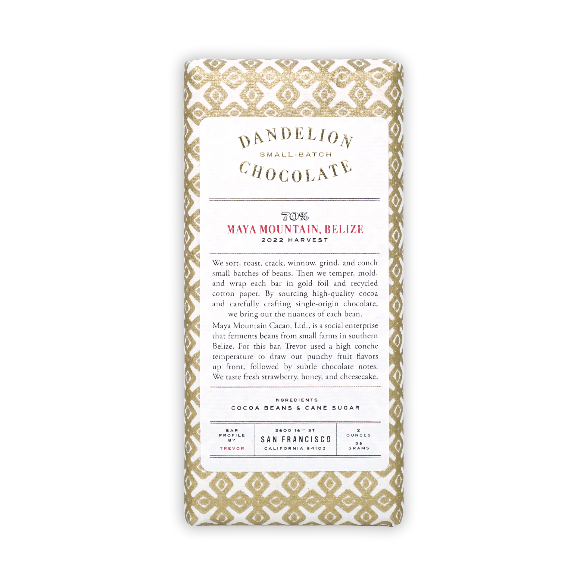 Maya Mountain Cacao, Ltd., is a social enterprise that ferments beans from small farms in southern Belize. For this bar, Trevor used a high conche temperature to draw out punchy fruit flavors up front, followed by subtle chocolate notes.