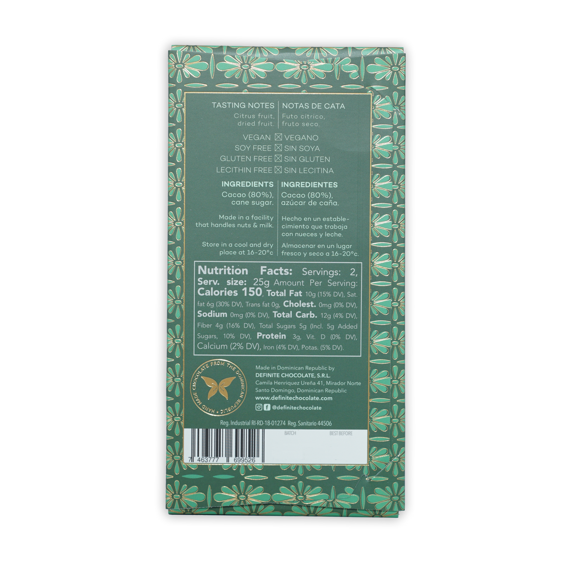 This 80% dark chocolate is made with cacao from Oko-Caribe, Dominican Republic and has tasting notes of jasmine, chamomile and lemon.