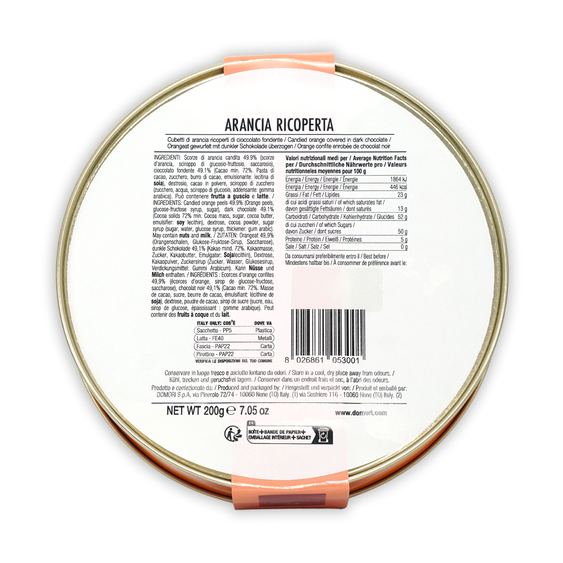 Ingredients: candied orange peels 49.9% (orange peels, glucose-fructose syrup, sugar), dark chocolate 49.1% (cocoa solids min. 72%. Cocoa mass, cane sugar, cocoa butter. Emulsifier: soy lecithin), dextrose, cocoa powder, sugar syrup (sugar, water, glucose syrup, thickener: gum arabic). Gluten-free.