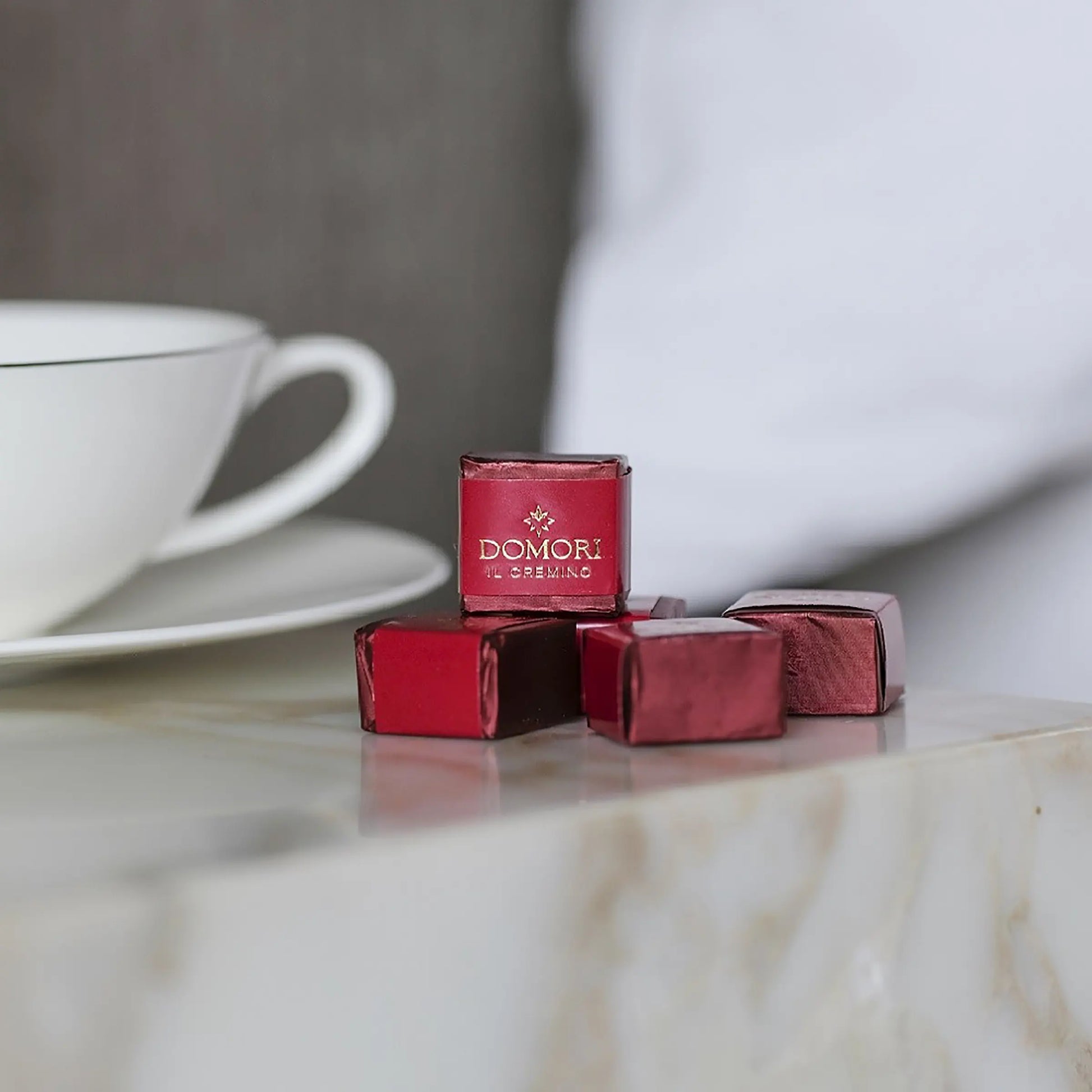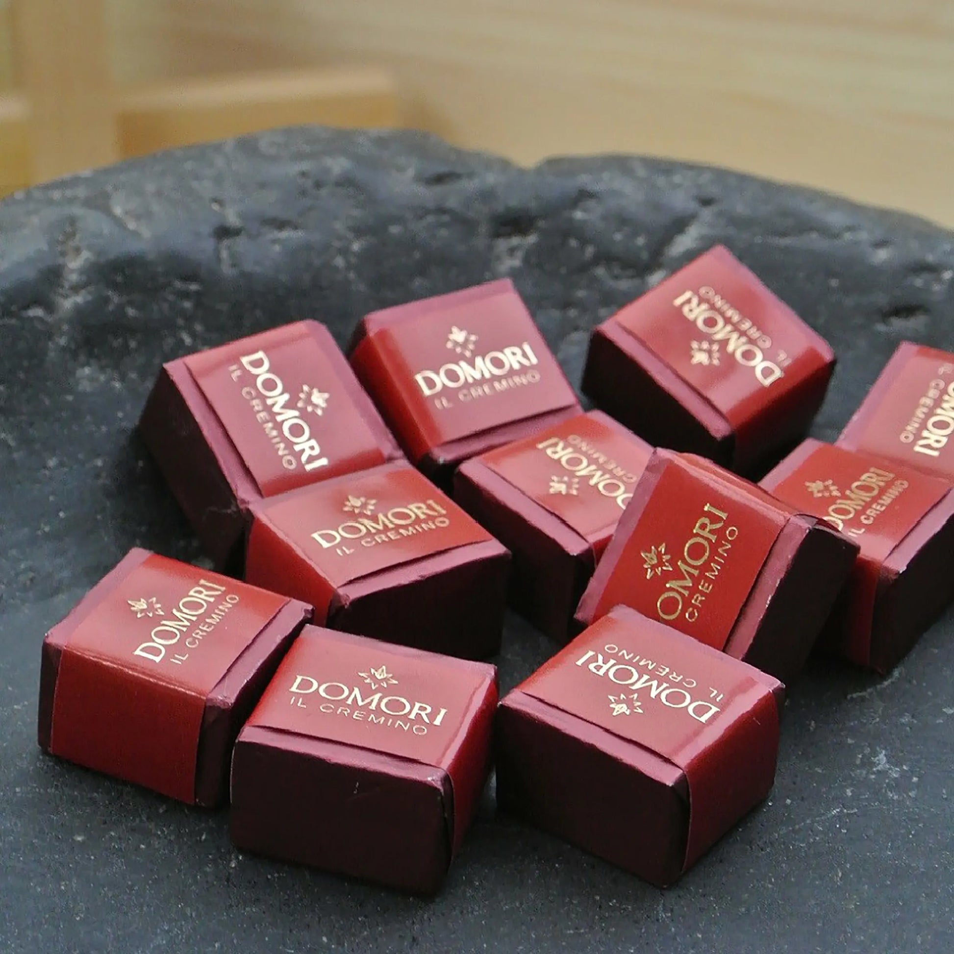 A classic of Piedmontese chocolate art: two layers of gianduja that enclose a layer of velvety hazelnut cream. A pinch of the precious fleur de sel to best enhance the fragrance of the hazelnut et voilà : Domori cremini. 10 or 20 cube pieces of cremini of 8 grams each.