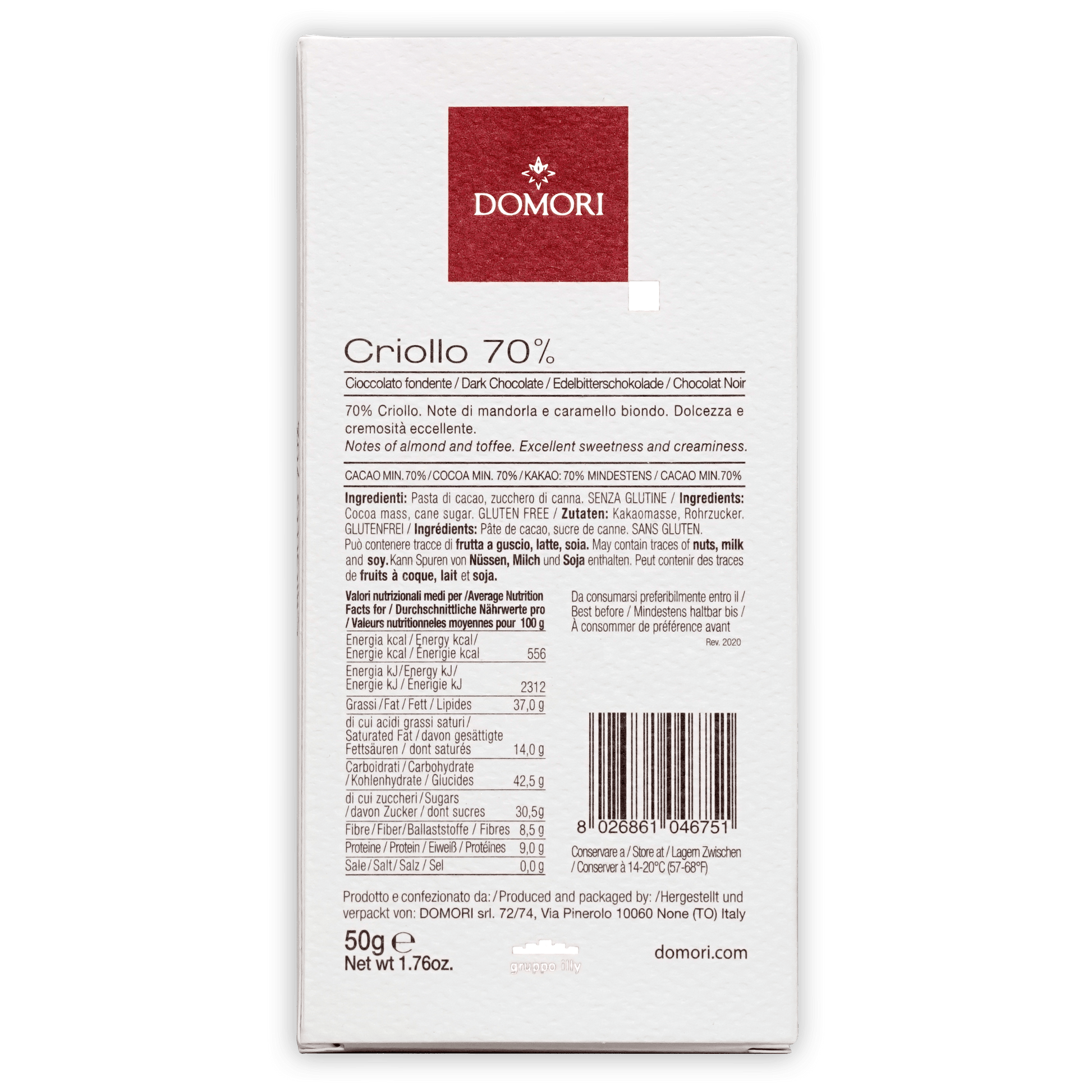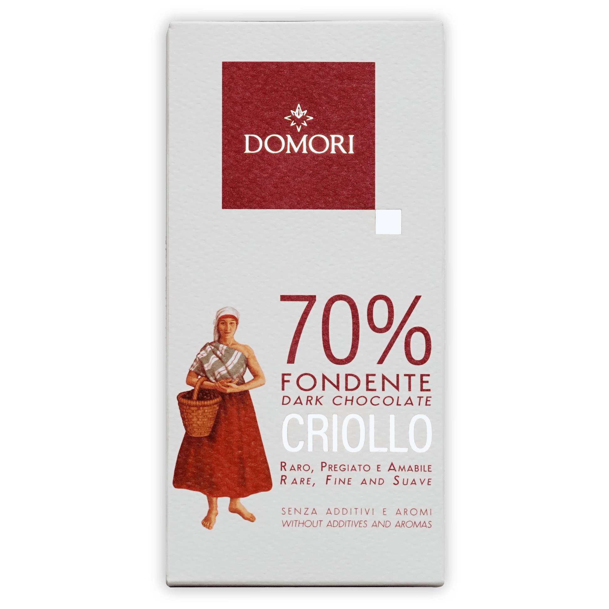 This chocolate, produced with 70% cocoa paste of Criollo variety, is characterized by an extraordinary roundness. On the palate it offers notes of almond and toffee. The result is a unique bar, with excellent sweetness and creaminess.