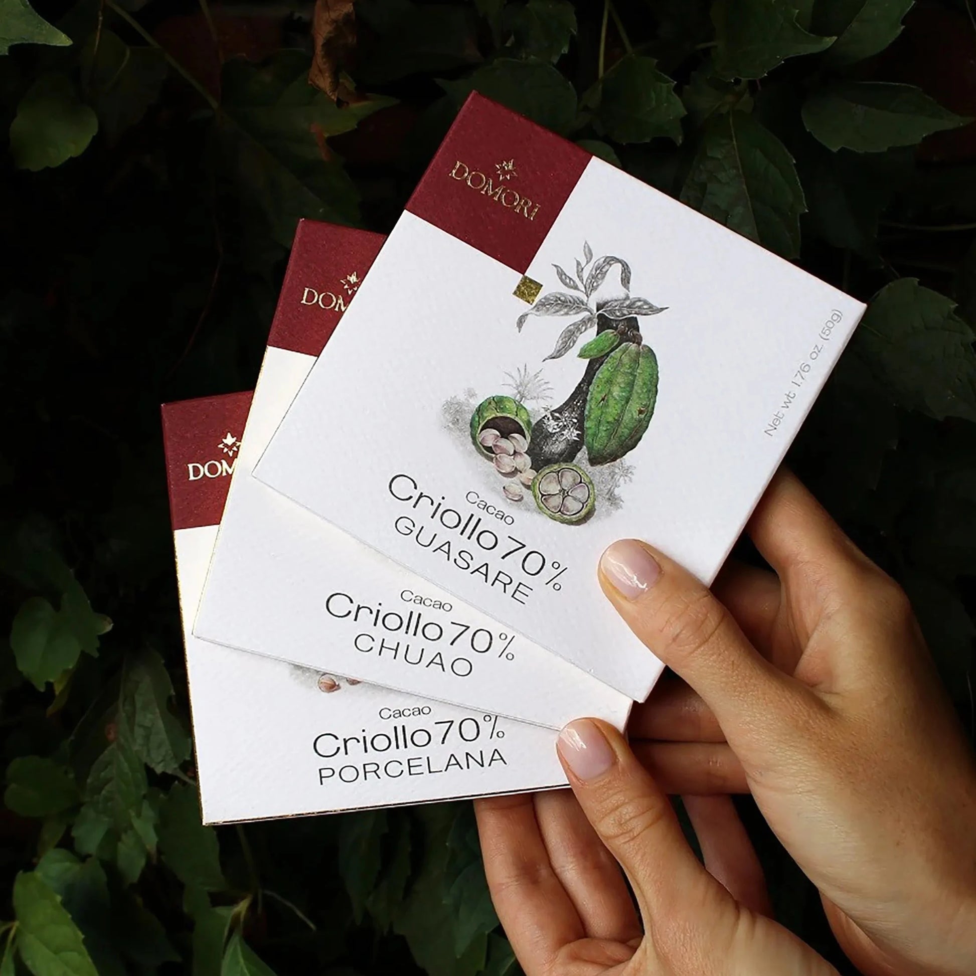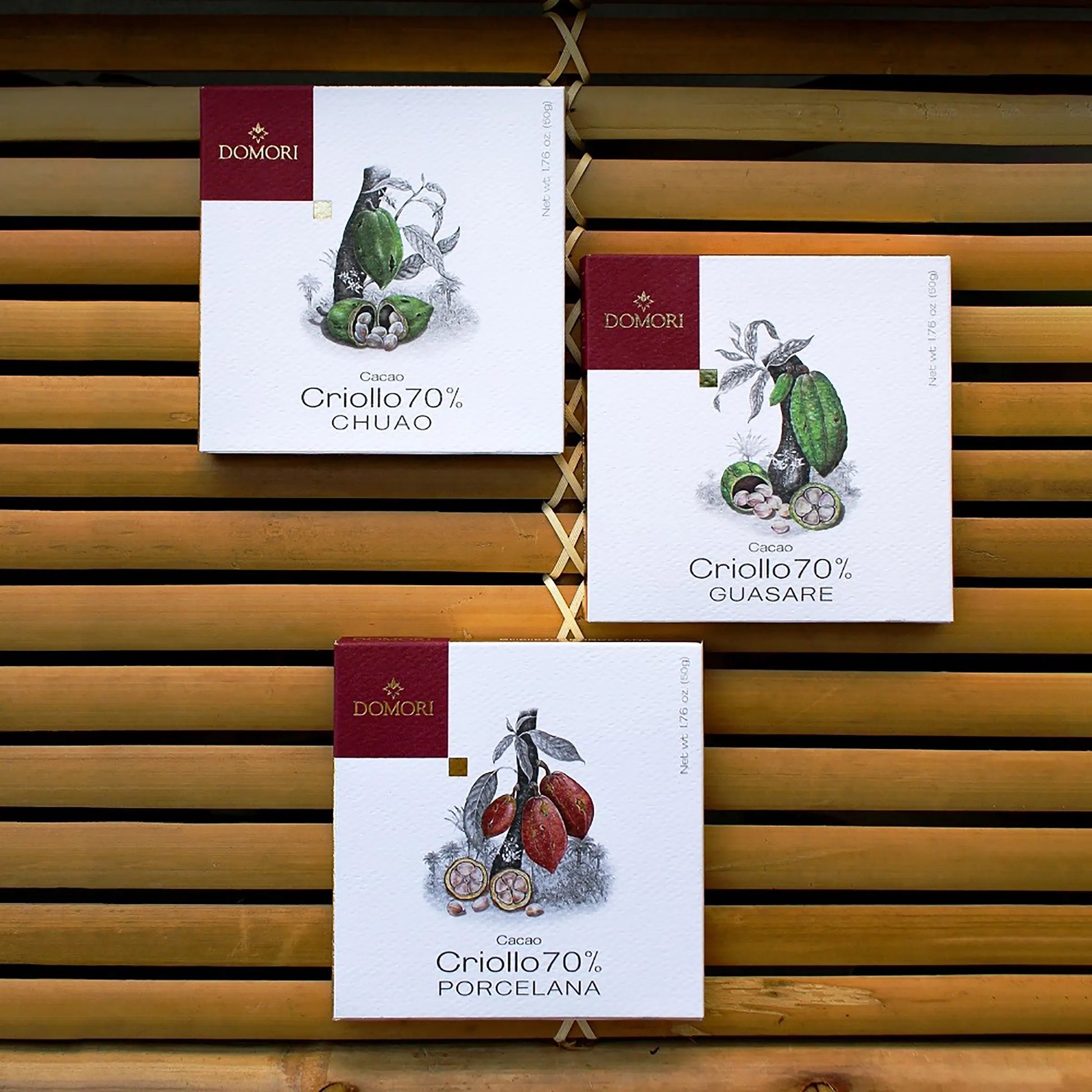 All three Criollo 50g bars from Domori, Porcelana, Chuao and Guasare. One of the world's most precious cocoa sources, coming from the historic Hacienda San Josè in Venezuela. A tasting set to discover the prestige of fine aromatic cocoa.