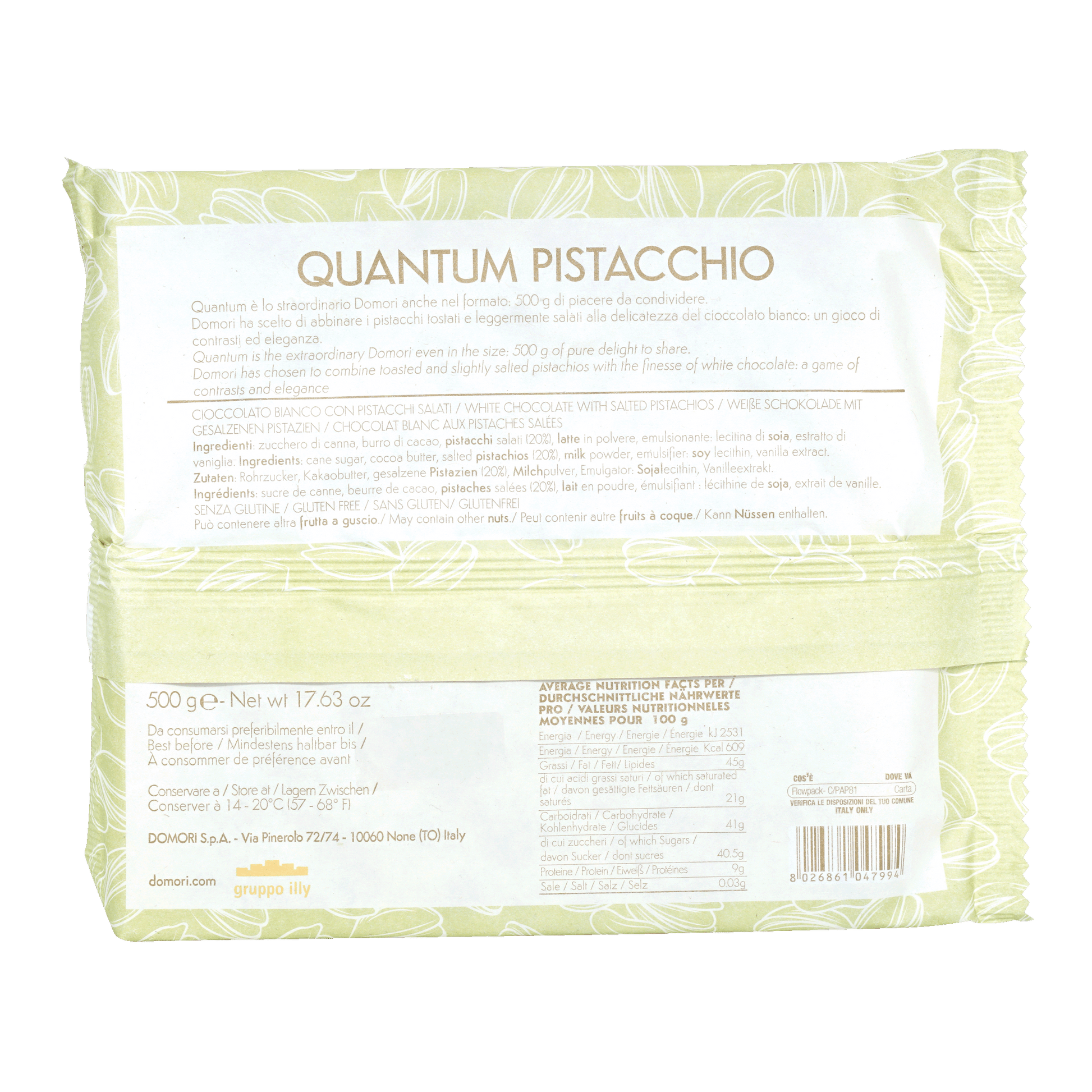 Domori reinvents this maxi 500g bar by combining the sweetness of white chocolate with the crunchiness of salted pistachios in order to satisfy any palate in search of new flavors to savor. This large format chocolate slab is great for social gatherings and sharing.