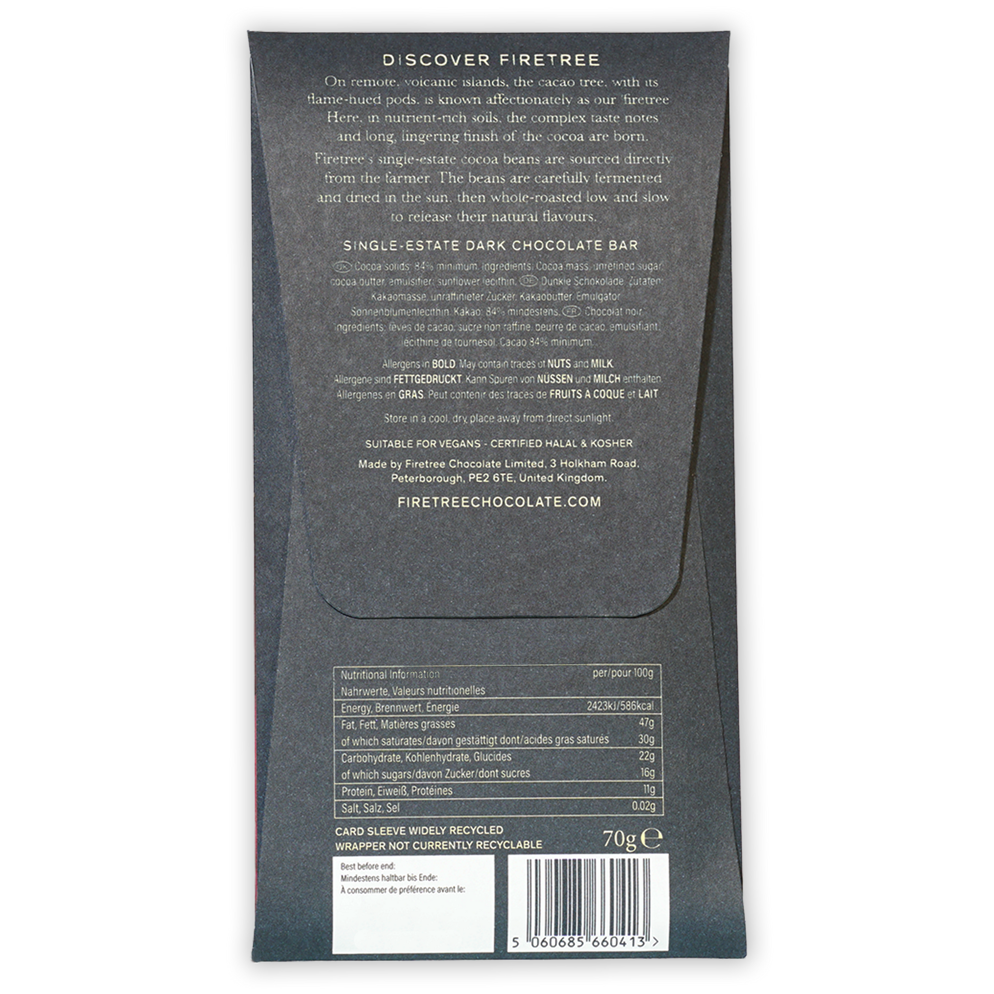 FiretreeFiretree Chocolate is dedicated to crafting rare, single estate chocolate with a true sense of place. They source their cocoa from small, remote volcanic islands in the South Pacific and Madagascar, where the mineral-rich soil creates some of the most distinctive taste notes in the world. The name “Firetree” comes from the cocoa tree’s flame-colored pods, and from its base in Cambridgeshire, England, the company follows a meticulous bean-to-bar process to preserve each origin’s character. Committed to fairness and sustainability, Firetree works directly with farmers or their co-ops, paying premiums that support communities and protect landscapes.