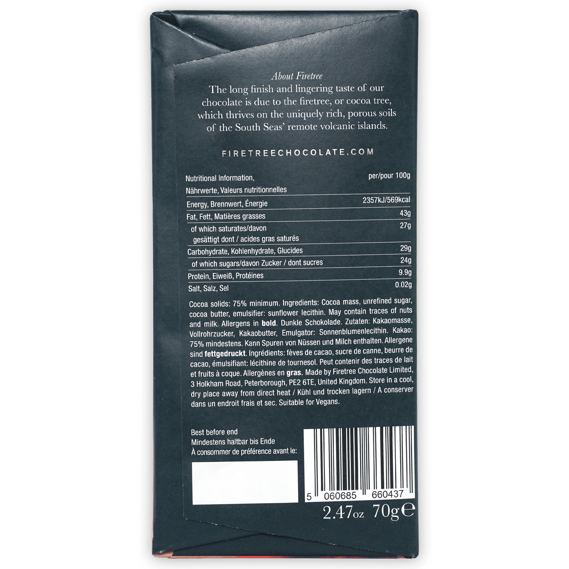 FiretreeFiretree Chocolate is dedicated to crafting rare, single estate chocolate with a true sense of place. They source their cocoa from small, remote volcanic islands in the South Pacific and Madagascar, where the mineral-rich soil creates some of the most distinctive taste notes in the world. The name “Firetree” comes from the cocoa tree’s flame-colored pods, and from its base in Cambridgeshire, England, the company follows a meticulous bean-to-bar process to preserve each origin’s character. Committed to fairness and sustainability, Firetree works directly with farmers or their co-ops, paying premiums that support communities and protect landscapes.