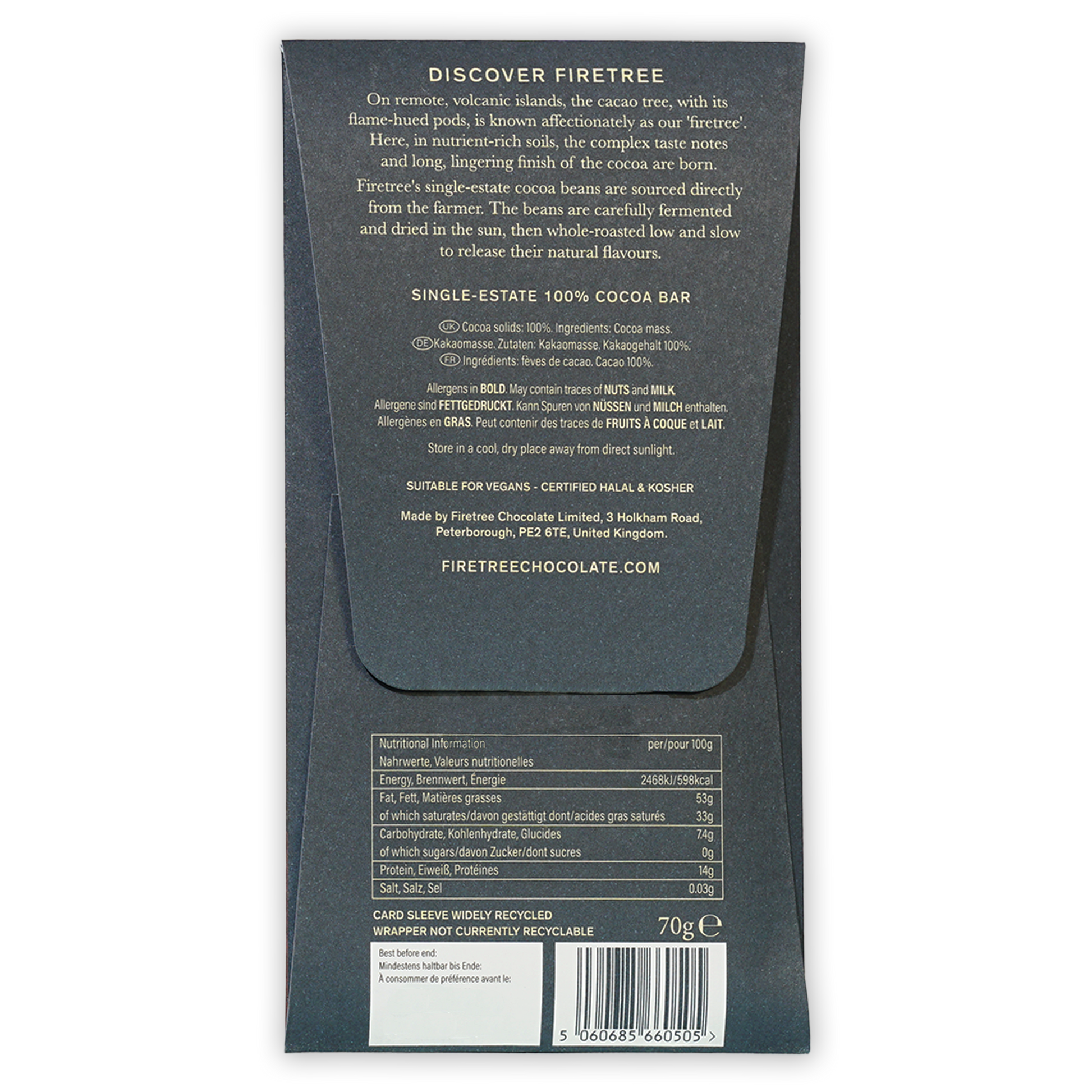 FiretreeFiretree Chocolate is dedicated to crafting rare, single estate chocolate with a true sense of place. They source their cocoa from small, remote volcanic islands in the South Pacific and Madagascar, where the mineral-rich soil creates some of the most distinctive taste notes in the world. The name “Firetree” comes from the cocoa tree’s flame-colored pods, and from its base in Cambridgeshire, England, the company follows a meticulous bean-to-bar process to preserve each origin’s character. Committed to fairness and sustainability, Firetree works directly with farmers or their co-ops, paying premiums that support communities and protect landscapes.