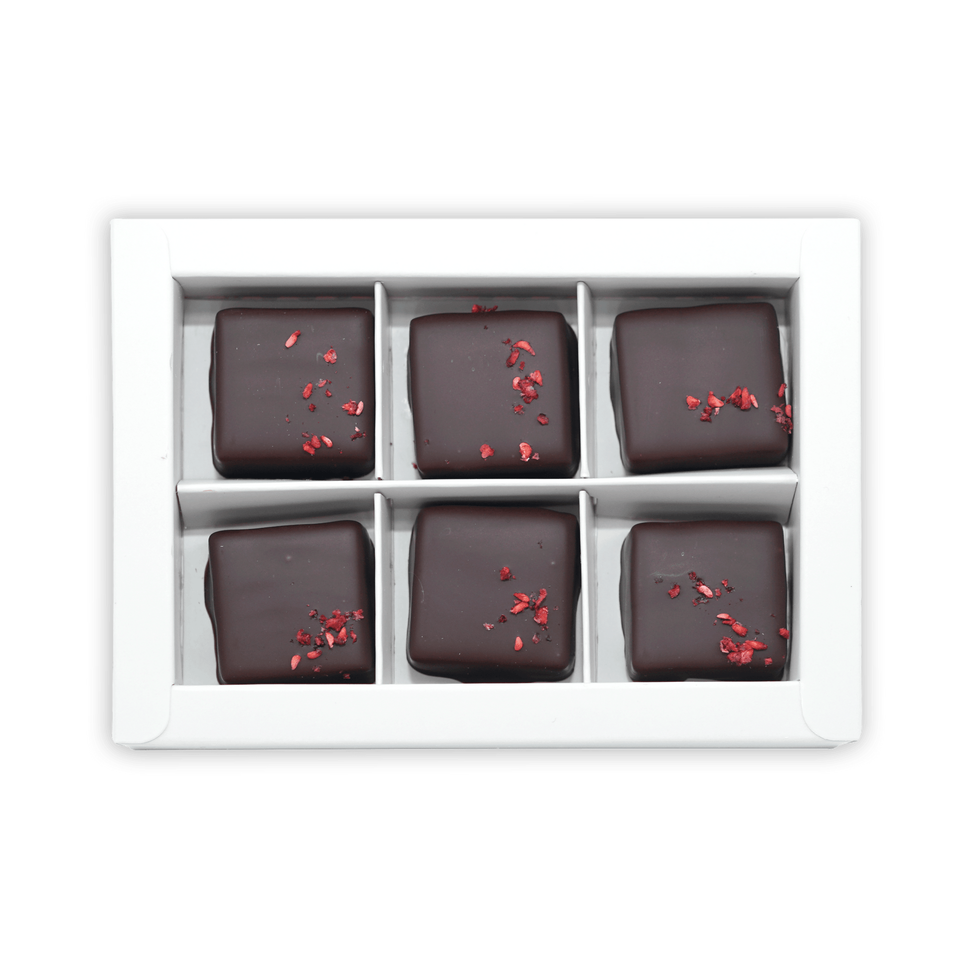 Creamy raspberry caramels are made with Norwegian raspberries and coated with their award-winning single-origin 70% Tanzania dark chocolate. Each box of 6 caramels is hand-packed with love.