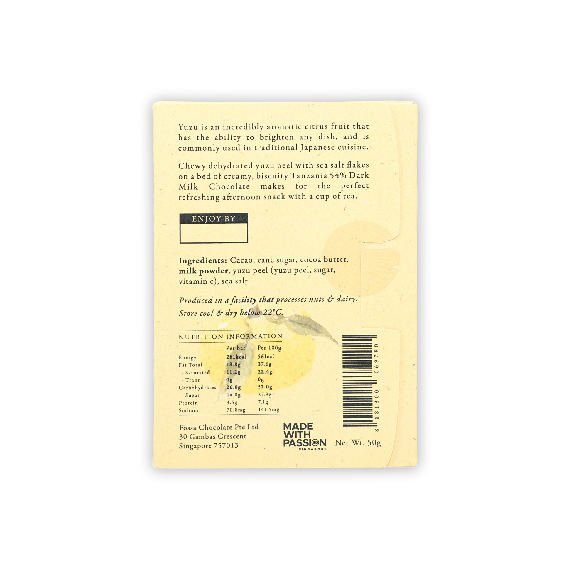 Chewy dehydrated yuzu peel with sea salt flakes on a bed of creamy, biscuity Tanzania 54% Dark Milk Chocolate makes for the perfect refreshing afternoon snack with a cup of tea.