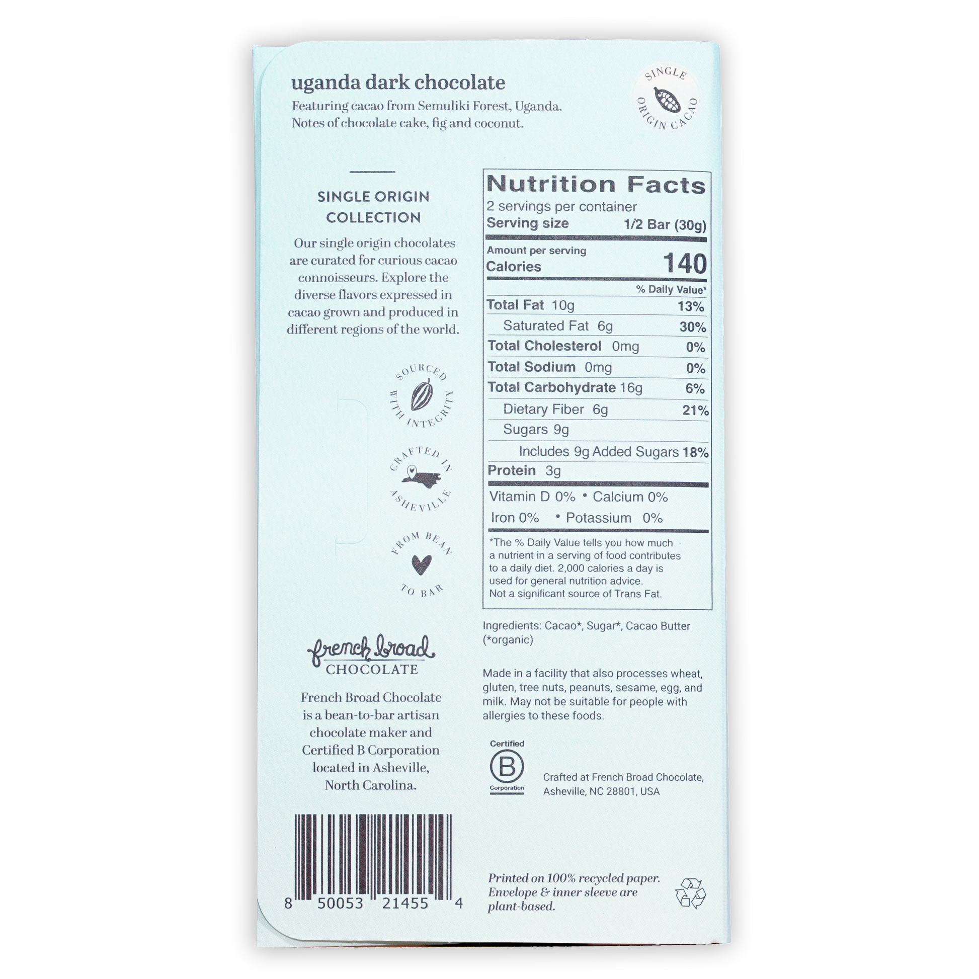 Semuliki ForestLocated in Bundibugyo, Western Uganda, Semuliki Forest Cacao is grown by over a thousand organic smallholder farmers in the region, more than half of whom are women. Latitude Trade Co. (LTC), the company that processes and exports this cacao, has organized 6 rural collection points for farmers to access, where every week they can sell fresh into the network and receive cash payment immediately. Latitude's centralized fermentation facility and warehouse is strategically located in the village of Bumate, where they can receive optimal natural light and limited impact from rainfall. All Semuliki Forest cacao is certified organic.