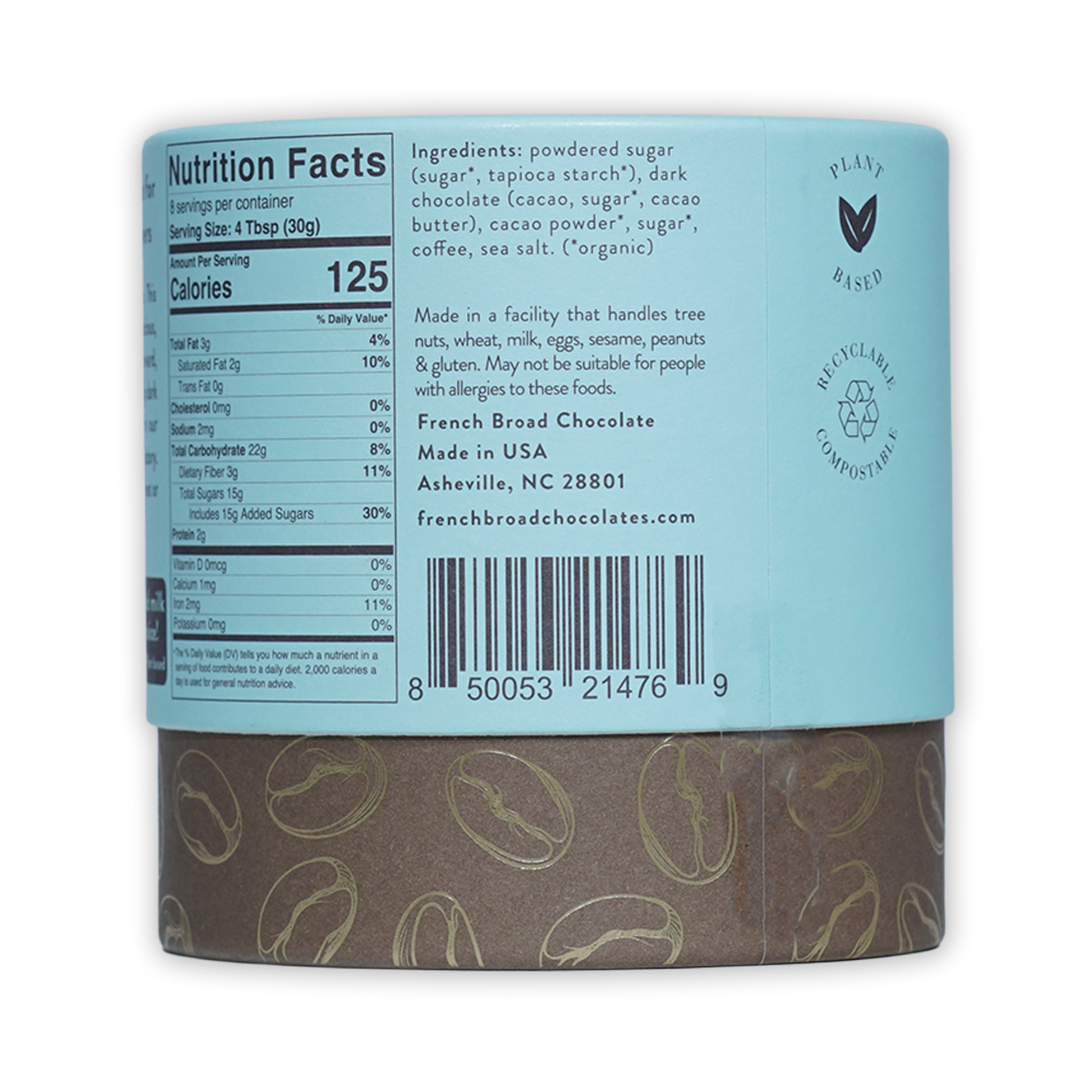 Ingredients: powdered sugar (sugar*, tapioca starch*), cacao powder*, cacao, sugar*, freeze-dried coffee, cacao butter, sea salt