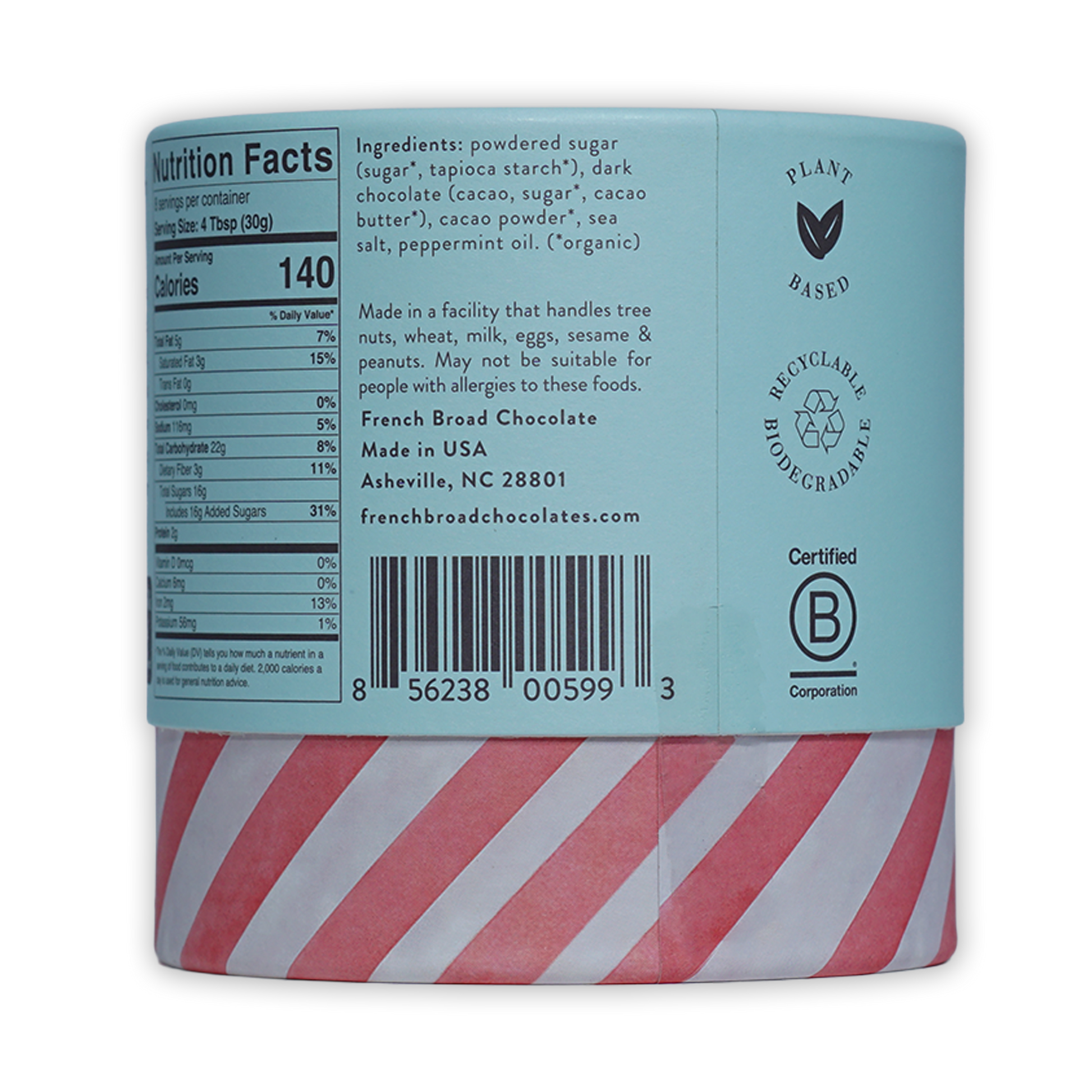 Ingredients: powdered sugar (sugar*, tapioca starch*), dark chocolate (cacao, sugar*, cacao butter*), cacao powder*, sea salt, peppermint oil.
