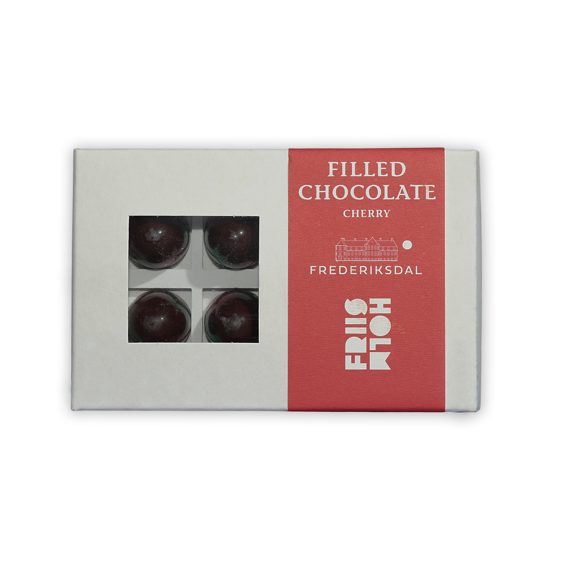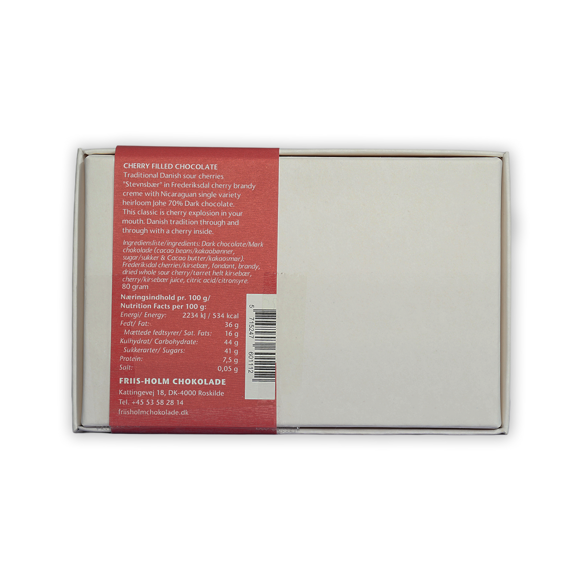Traditional Danish sour cherries "Stevnsbær" in Frederiksdal cherry brandy creme with Nicaraguan single variety heirloom Johe 70 % dark chocolate. This classic is a cherry explosion in your mouth! Danish tradition through and through.