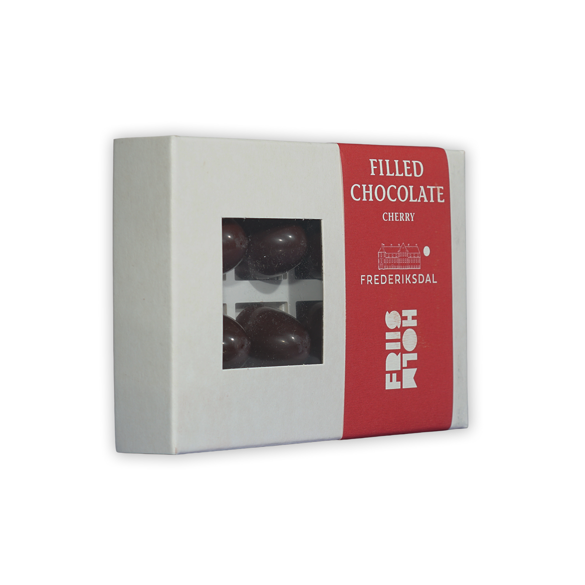 Ingredients: Dark chocolate (cacao beans, sugar, cacao butter), Frederiksdal cherries, fondant, brandy, dried whole sour cherry, cherry juice, citric acid.