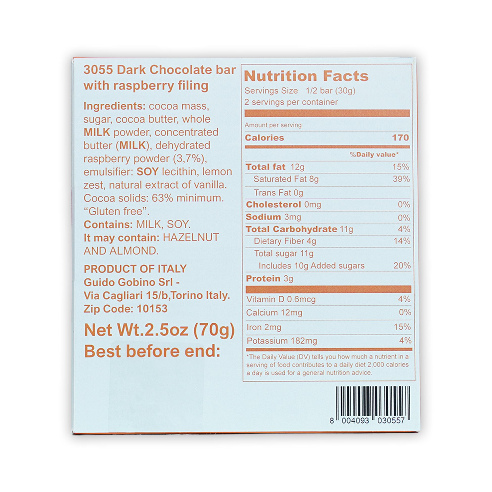 Ingredients: Cocoa mass, sugar, cocoa butter, whole milk powder, concentrated butter (milk), dehydrated raspberry powder (3.7%), emulsifier: soy lecithin, lemon zest, natural extract of vanilla. Cocoa solids: 63% minimum. Gluten free.