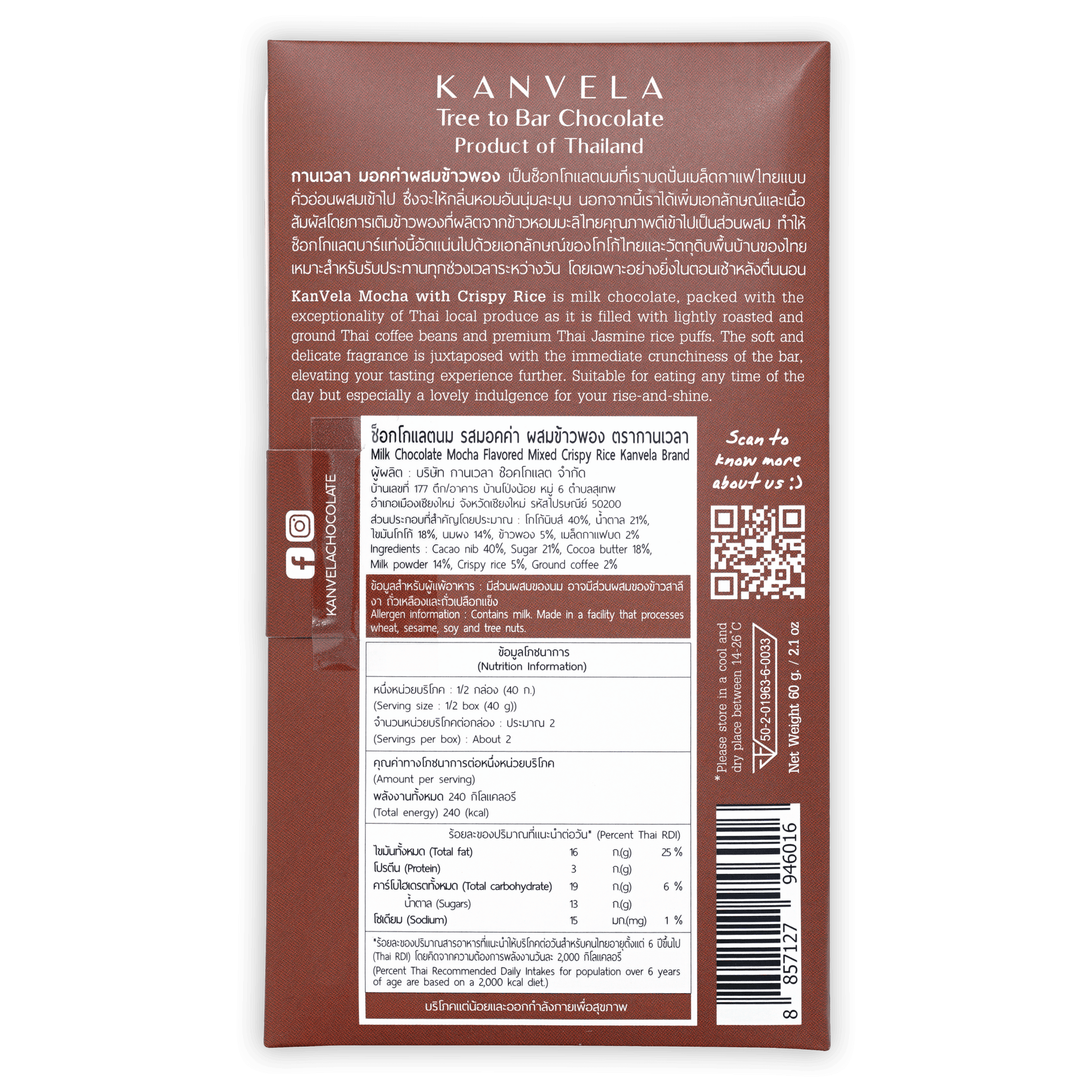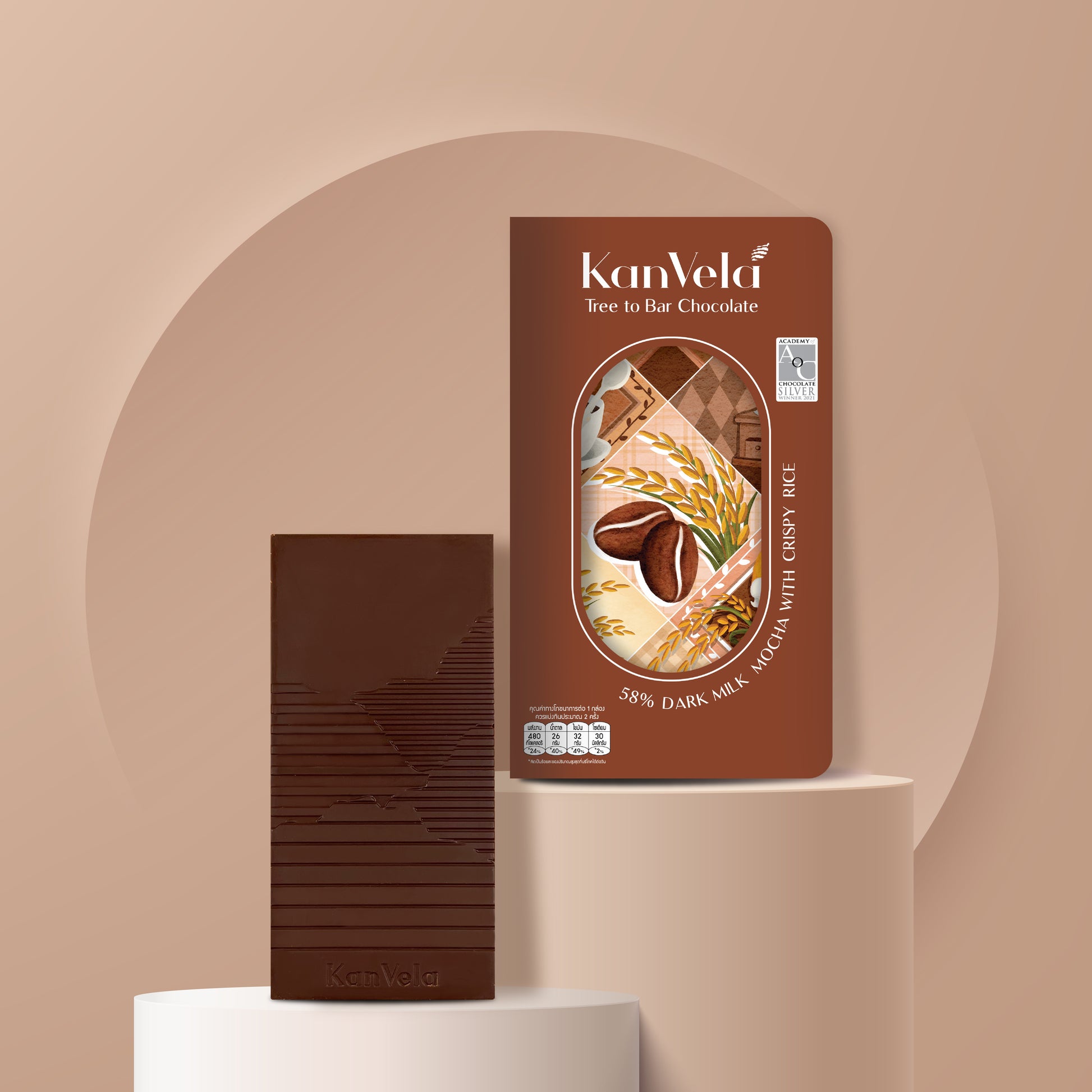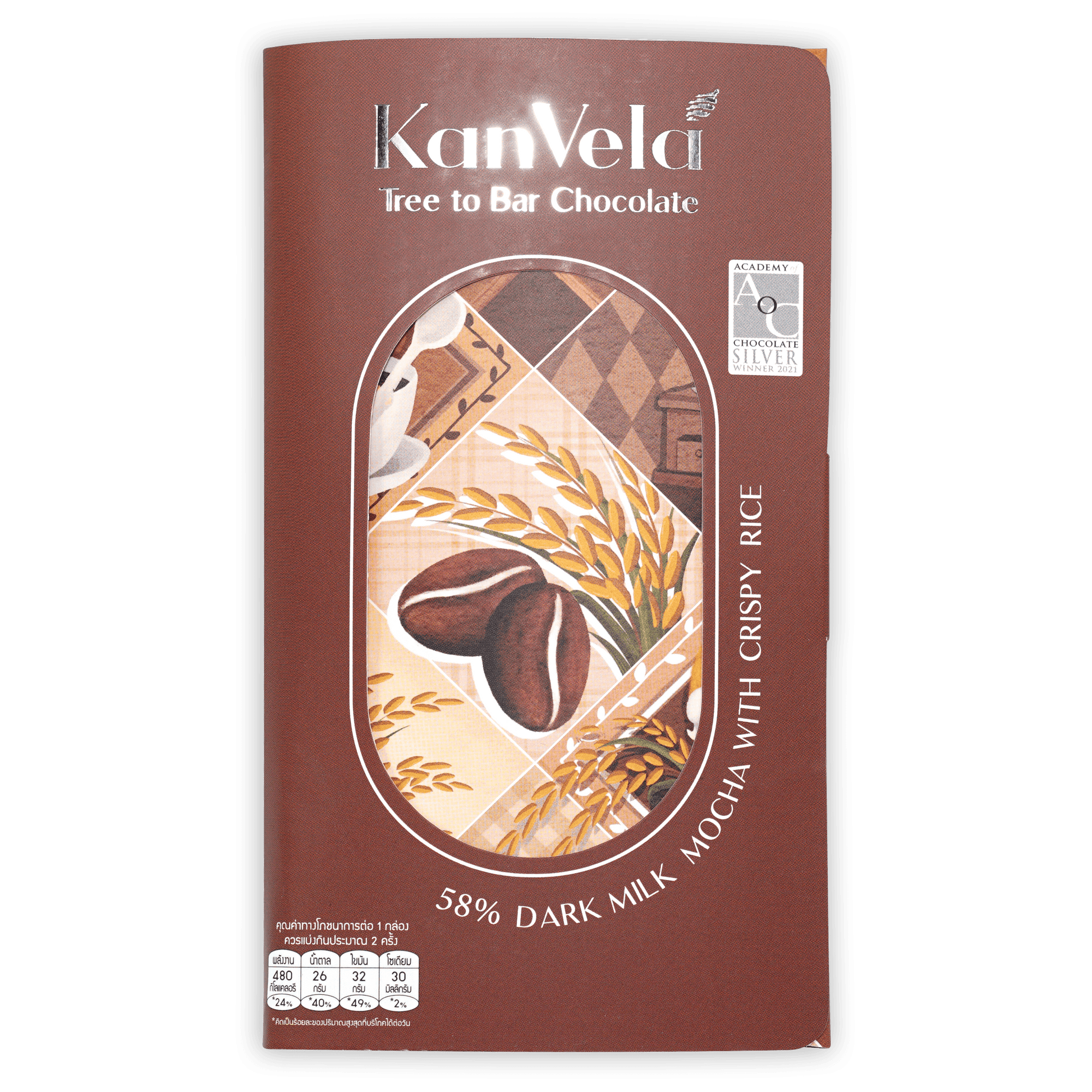 KanVela Mocha with Crispy Rice is milk chocolate, packed with the exceptionality of Thai local produce as it is filled with lightly roasted and ground Thai coffee beans and premium Thai Jasmine rice puffs. The soft and delicate fragrance is juxtaposed with the immediate crunchiness of the bar, elevating your tasting experience further. Suitable for eating any time of the day but especially a lovely indulgence for your rise-and-shine.