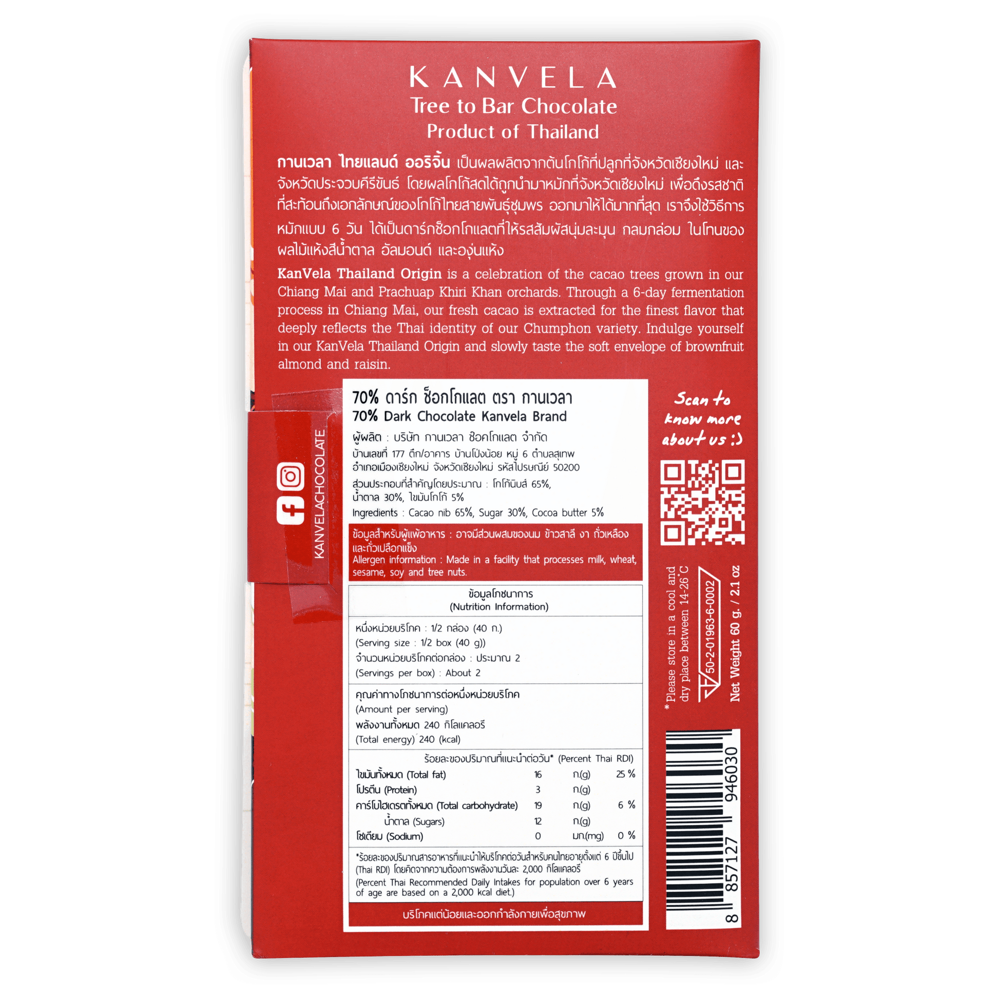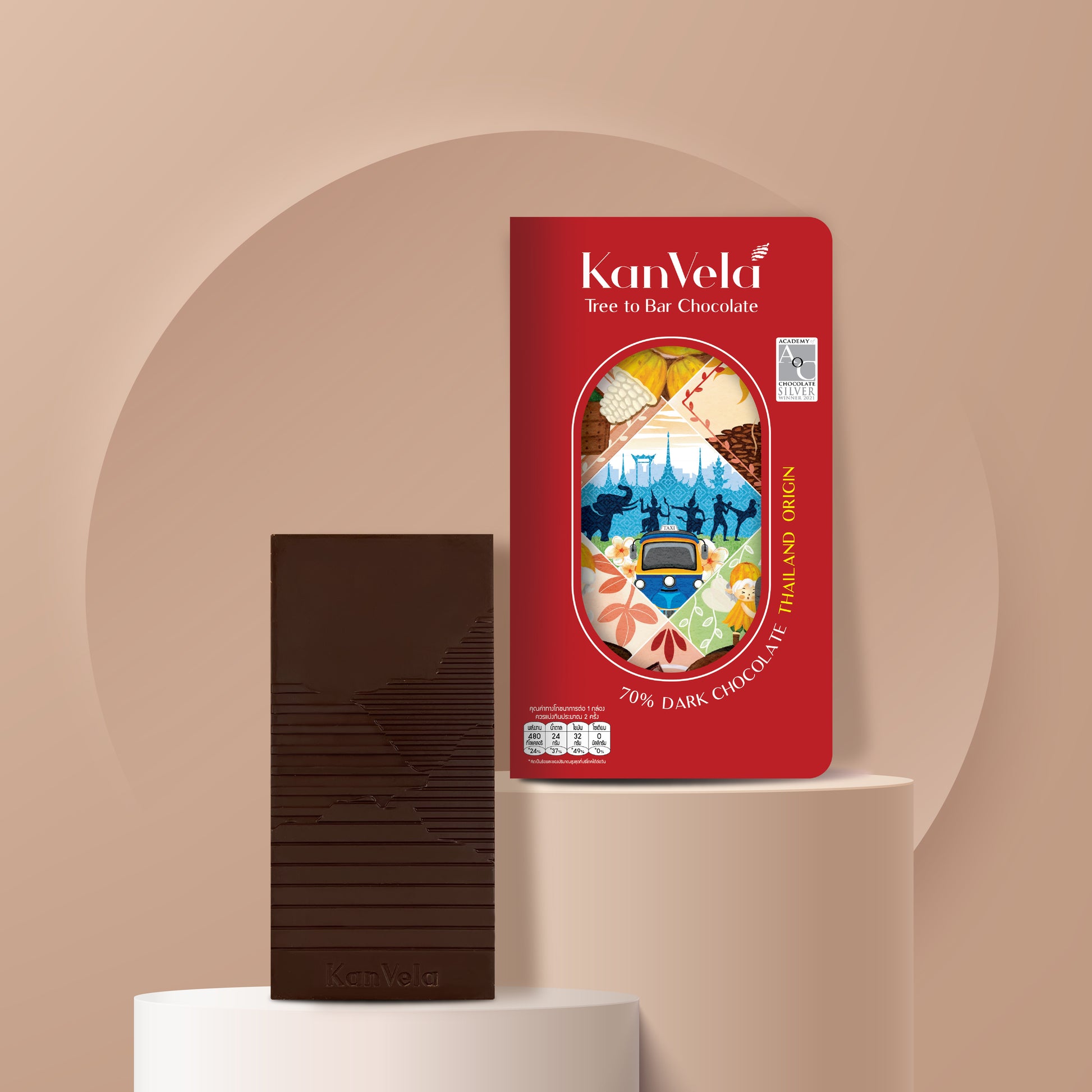 KanVela Thailand Origin is a celebration of the cacao trees grown in their Chiang Mai and Prachuap Khiri Khan orchards. Through a 6-day fermentation process in Chiang Mai, their fresh cacao is extracted for the finest flavor that deeply reflects the Thai identity of their Chumphon variety. Indulge yourself in their KanVela Thailand Origin and slowly taste the soft envelope of brown fruit almonds and raisins.