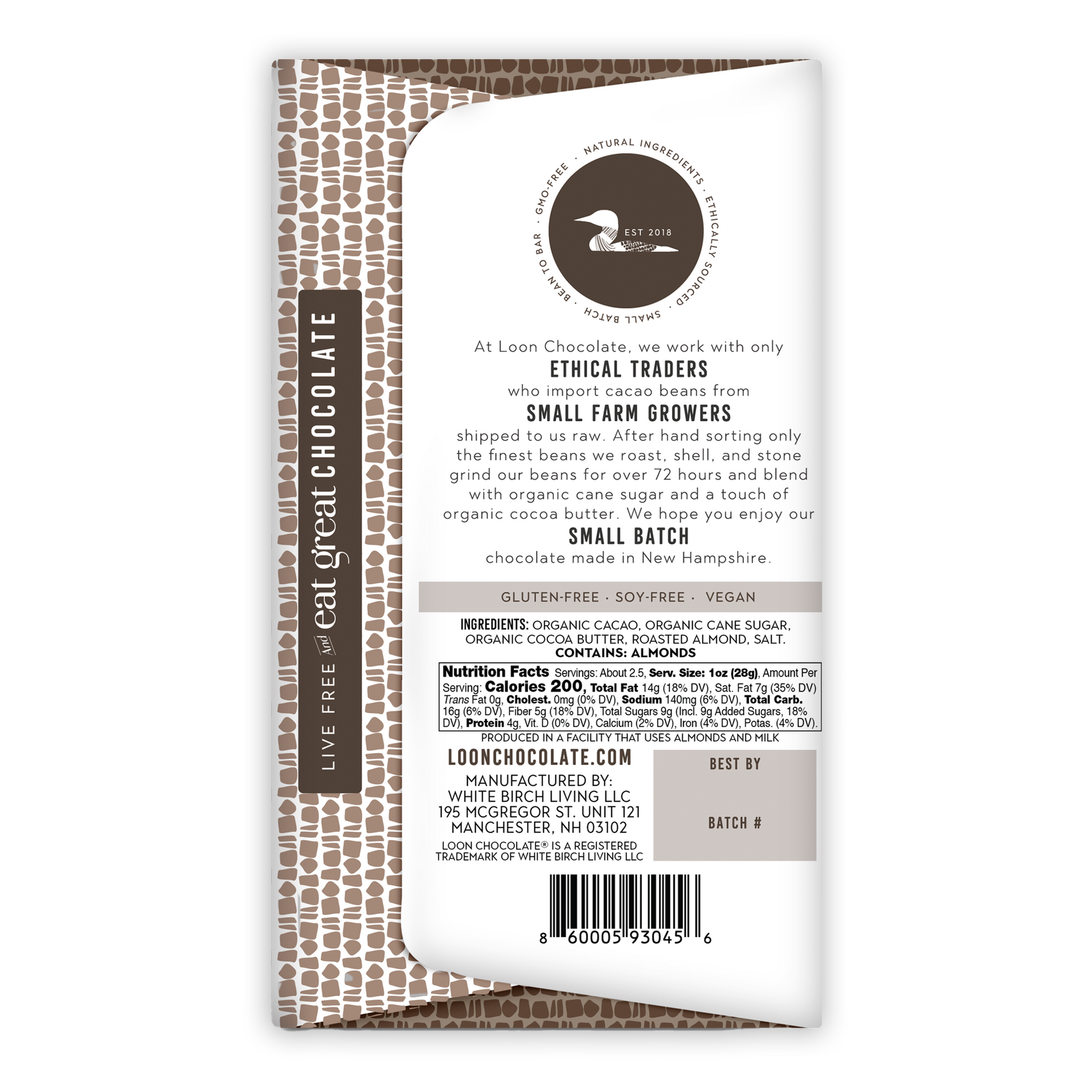 Loon ChocolateLoon Chocolate from New Hampshire, NH only works with ethical traders who import cacao beans (cocoa beans) from small farm growers. After hand sorting the finest beans they roast, shell and stone grind their beans for over 72 hours and blend with organic vegan sugar with a touch of organic cocoa butter. Loon Chocolate wants you to taste the subtle, savory, and sweet differences in their chocolate offers and celebrate all types of chocolate from around the world—one bar at a time.