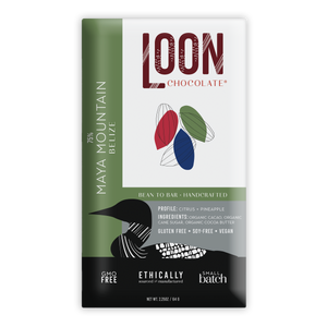 Loon ChocolateLoon Chocolate from New Hampshire, NH only works with ethical traders who import cacao beans (cocoa beans) from small farm growers. After hand sorting the finest beans they roast, shell and stone grind their beans for over 72 hours and blend with organic vegan sugar with a touch of organic cocoa butter. Loon Chocolate wants you to taste the subtle, savory, and sweet differences in their chocolate offers and celebrate all types of chocolate from around the world—one bar at a time.