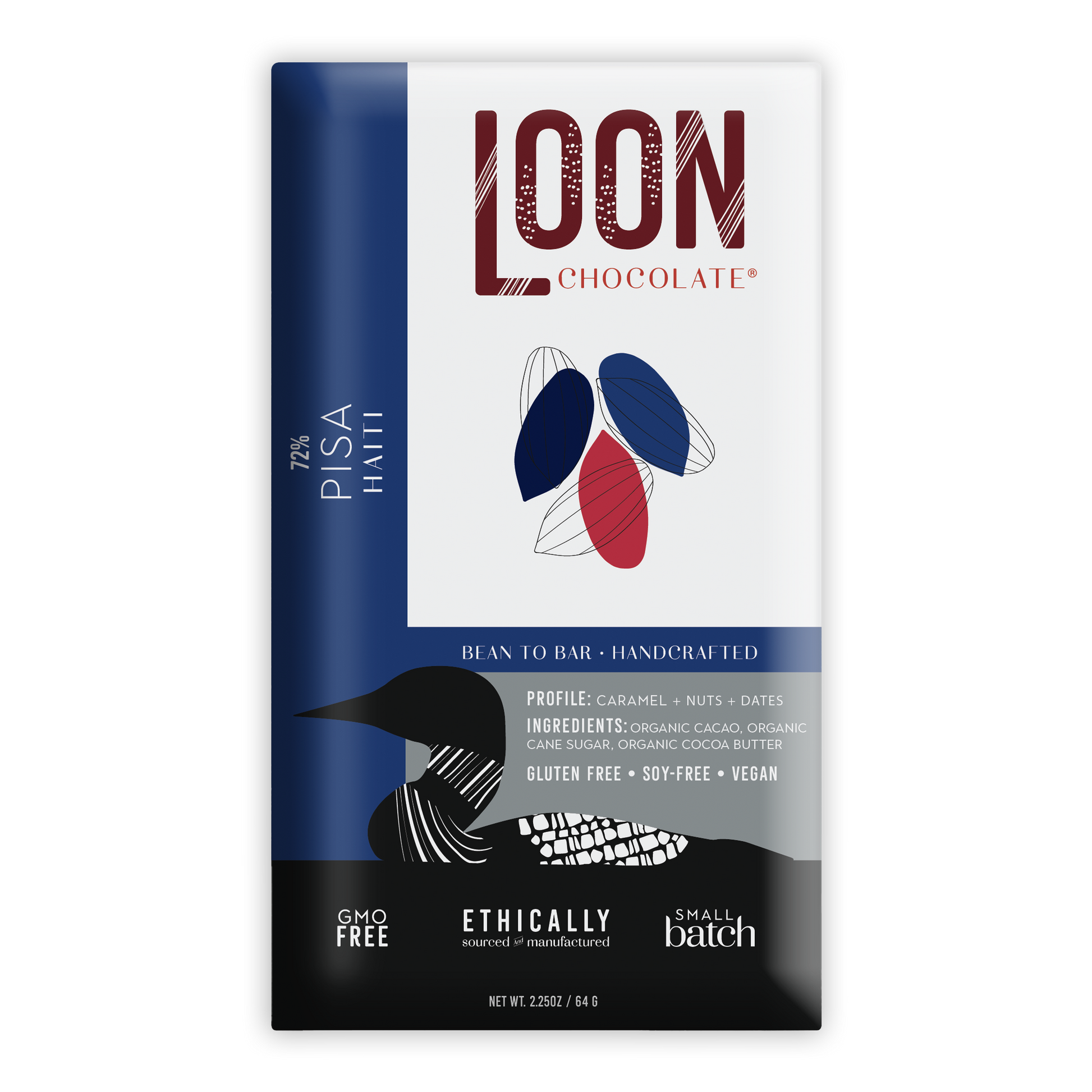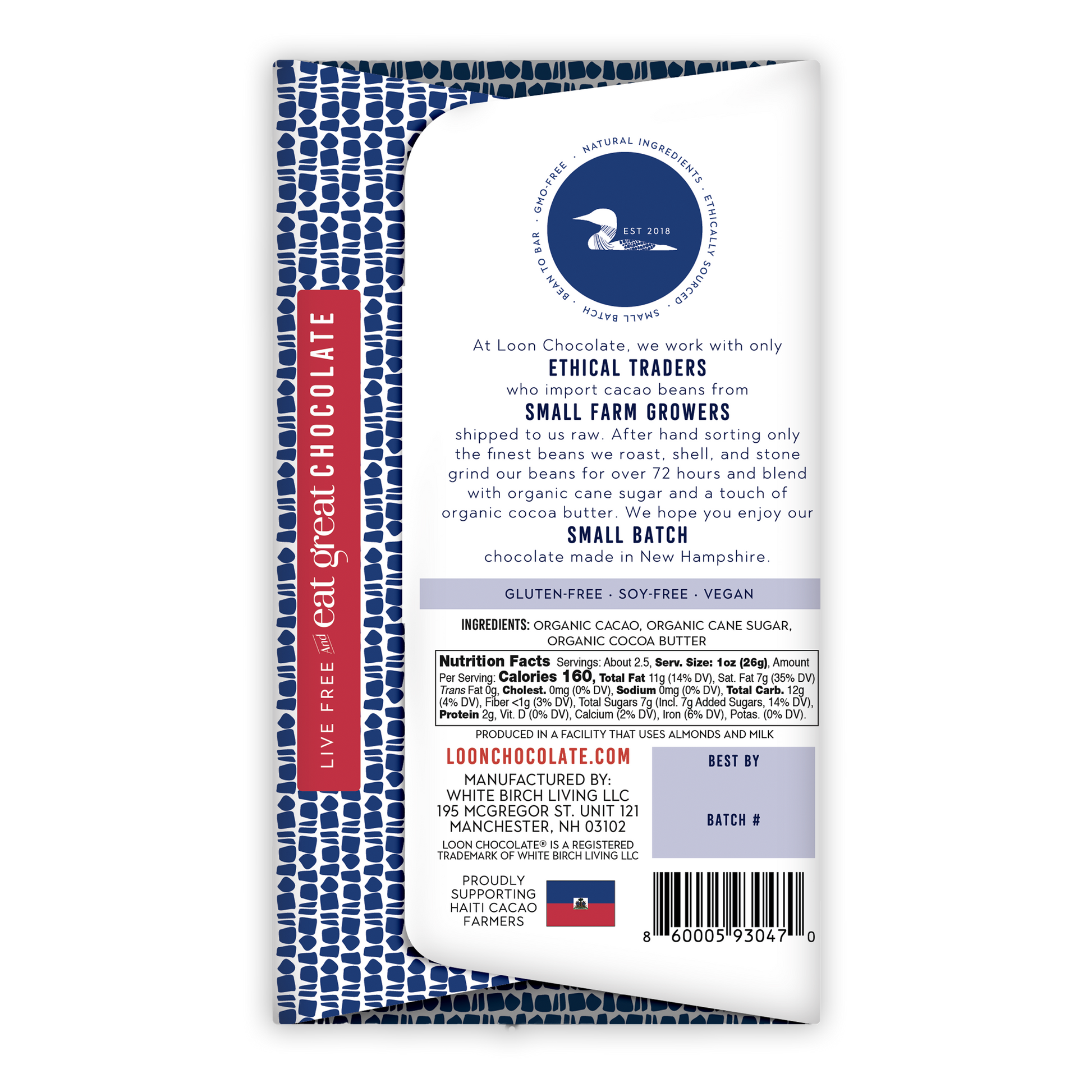 Loon ChocolateLoon Chocolate from New Hampshire, NH only works with ethical traders who import cacao beans (cocoa beans) from small farm growers. After hand sorting the finest beans they roast, shell and stone grind their beans for over 72 hours and blend with organic vegan sugar with a touch of organic cocoa butter. Loon Chocolate wants you to taste the subtle, savory, and sweet differences in their chocolate offers and celebrate all types of chocolate from around the world—one bar at a time.