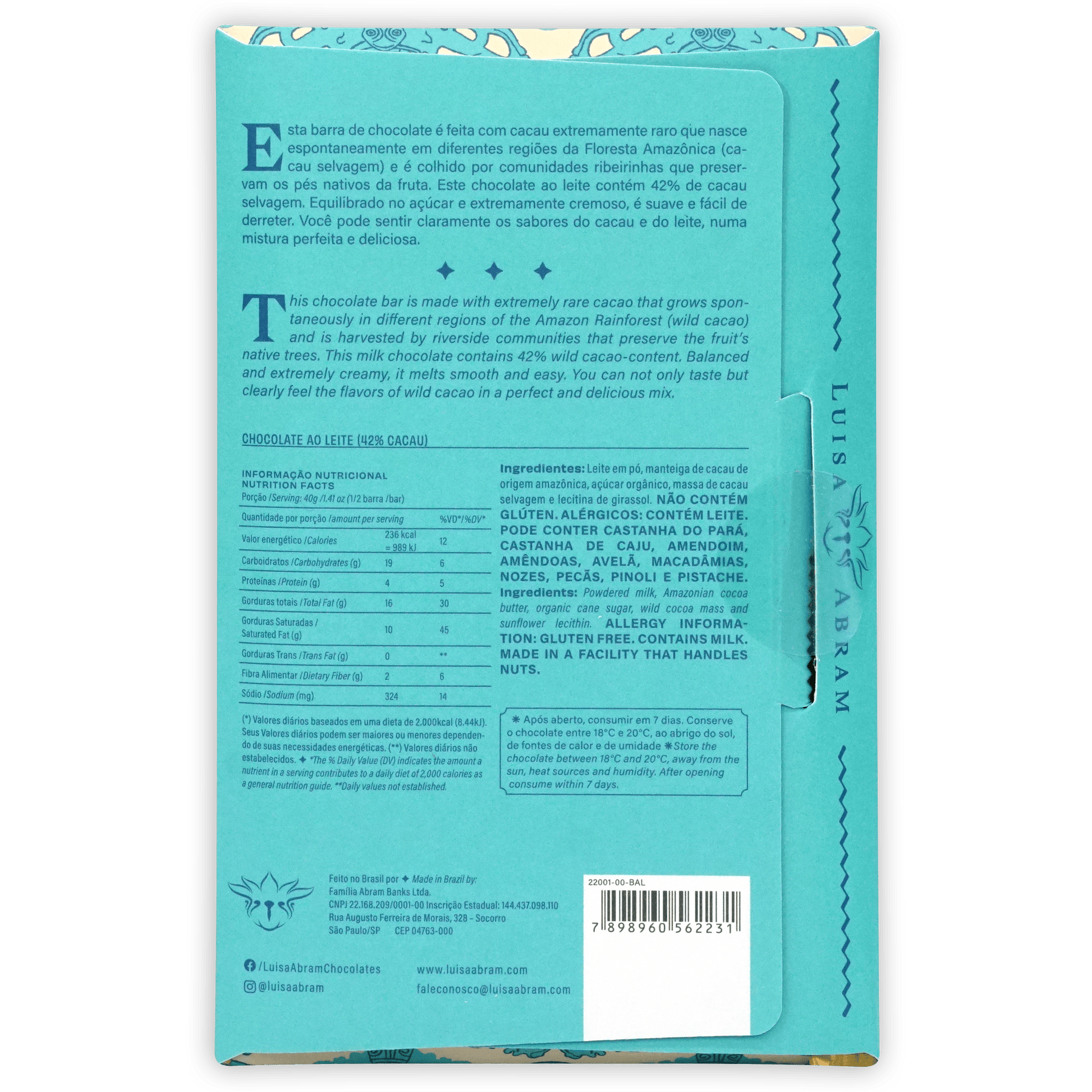 Luisa Abram made this bar with Jersey cow milk (like all of their bars that contain milk), which means it has 20% more protein, 15% more calcium and 20% more solids then any other milk on the market. The milk is 100% made by Luisa Abram. That means you can't just go to a store and buy it. This bar is where they let the milk really shine. The most perfect combination for their wild cocoa from the Lower Amazon Basin. This bar is smooth and easy-melting. Even within the creamy milk you can still feel the incredible flavors of the cocoa.